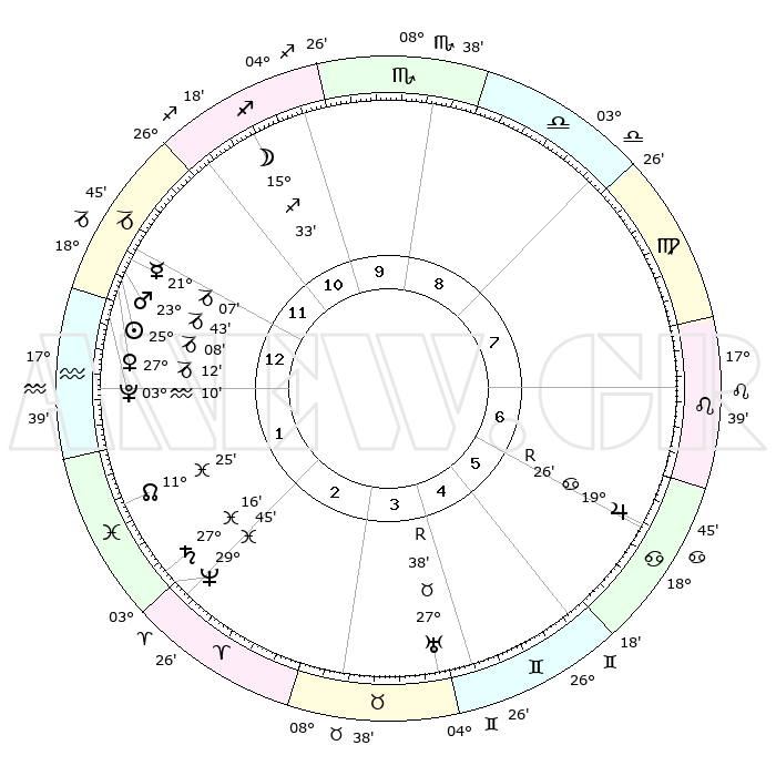 | | ΘΕΣΕΙΣ ΠΛΑΝΗΤΩΝ ΑΣΤΡΟΛΟΓΙΚΟΥ ΧΑΡΤΗ ΤΗΣ ΣΤΙΓΜΗΣ ΑΥΤΗΣ | | | | Πλανήτης | Ζώδιο | Μοίρες | Δεκαήμ. | Σε οίκο | Απόκλιση | | Ακμές των οίκων | | Ηλιος | Αιγόκερως | 25°04' | Τρίτο | 1 | 21 S 07 | | 1ος | 17°00' | Αιγόκερως | | Σελήνη | Τοξότης | 14°42' | Δεύτερο | 11 | 27 S 38 | | 2ος | 28°27' | Υδροχόος | | Ερμής | Αιγόκερως | 20°60' | Τρίτο | 1 | 23 S 34 | | 3ος | 08°26' | Κριός | | Αφροδίτη | Αιγόκερως | 27°06' | Τρίτο | 1 | 21 S 42 | | 4ος | 09°17' | Ταύρος | | Αρης | Αιγόκερως | 23°40' | Τρίτο | 1 | 22 S 19 | | 5ος | 03°15' | Δίδυμοι | | Δίας | Καρκίνος | 19°27'R | Δεύτερο | 7 | 22 N 18 | | 6ος | 24°28' | Δίδυμοι | | Κρόνος | Ιχθείς | 27°16' | Τρίτο | 2 | 03 S 07 | | 7ος | 17°00' | Καρκίνος | | Ουρανός | Ταύρος | 27°38'R | Τρίτο | 4 | 19 N 26 | | 8ος | 28°27' | Λέων | | Ποσειδώνας | Ιχθείς | 29°44' | Τρίτο | 2 | 01 S 19 | | 9ος | 08°26' | Ζυγός | | Πλούτωνας | Υδροχόος | 03°10' | Πρώτο | 1 | 23 S 08 | | 10ος | 09°17' | Σκορπιός | | Β. Δεσμός | Ιχθείς | 11°25' | Δεύτερο | 2 | 07 S 17 | | 11ος | 03°15' | Τοξότης | | Ωροσκόπος | Αιγόκερως | 17°00' | Δεύτερο | | | 12ος | 24°28' | Τοξότης | | Μεσουράνημα | Σκορπιός | 09°17' | Πρώτο | | | |