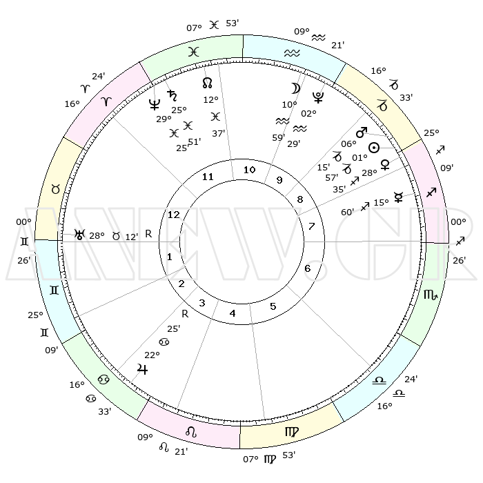 | | ΘΕΣΕΙΣ ΠΛΑΝΗΤΩΝ ΑΣΤΡΟΛΟΓΙΚΟΥ ΧΑΡΤΗ ΤΗΣ ΣΤΙΓΜΗΣ ΑΥΤΗΣ | | | | Πλανήτης | Ζώδιο | Μοίρες | Δεκαήμ. | Σε οίκο | Απόκλιση | | Ακμές των οίκων | | Ηλιος | Αιγόκερως | 01°53' | Πρώτο | 9 | 23 S 25 | | 1ος | 22°26' | Κριός | | Σελήνη | Υδροχόος | 10°01' | Δεύτερο | 11 | 20 S 16 | | 2ος | 26°46' | Ταύρος | | Ερμής | Τοξότης | 15°53' | Δεύτερο | 8 | 22 S 14 | | 3ος | 21°09' | Δίδυμοι | | Αφροδίτη | Τοξότης | 28°29' | Τρίτο | 9 | 23 S 36 | | 4ος | 12°51' | Καρκίνος | | Αρης | Αιγόκερως | 06°11' | Πρώτο | 9 | 24 S 07 | | 5ος | 06°34' | Λέων | | Δίας | Καρκίνος | 22°25'R | Τρίτο | 4 | 21 N 47 | | 6ος | 07°49' | Παρθένος | | Κρόνος | Ιχθείς | 25°51' | Τρίτο | 12 | 03 S 45 | | 7ος | 22°26' | Ζυγός | | Ουρανός | Ταύρος | 28°12'R | Τρίτο | 2 | 19 N 34 | | 8ος | 26°46' | Σκορπιός | | Ποσειδώνας | Ιχθείς | 29°25' | Τρίτο | 12 | 01 S 27 | | 9ος | 21°09' | Τοξότης | | Πλούτωνας | Υδροχόος | 02°28' | Πρώτο | 10 | 23 S 16 | | 10ος | 12°51' | Αιγόκερως | | Β. Δεσμός | Ιχθείς | 12°37' | Δεύτερο | 12 | 06 S 49 | | 11ος | 06°34' | Υδροχόος | | Ωροσκόπος | Κριός | 22°26' | Τρίτο | | | 12ος | 07°49' | Ιχθείς | | Μεσουράνημα | Αιγόκερως | 12°51' | Δεύτερο | | | |
