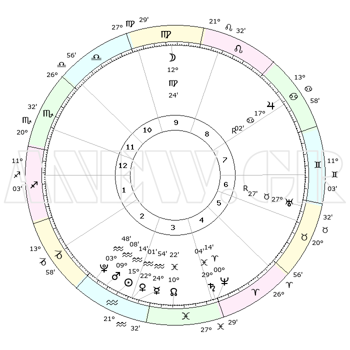 | | ΘΕΣΕΙΣ ΠΛΑΝΗΤΩΝ ΑΣΤΡΟΛΟΓΙΚΟΥ ΧΑΡΤΗ ΤΗΣ ΣΤΙΓΜΗΣ ΑΥΤΗΣ | | | | Πλανήτης | Ζώδιο | Μοίρες | Δεκαήμ. | Σε οίκο | Απόκλιση | | Ακμές των οίκων | | Ηλιος | Υδροχόος | 15°11' | Δεύτερο | 3 | 16 S 17 | | 1ος | 26°06' | Σκορπιός | | Σελήνη | Παρθένος | 11°43' | Δεύτερο | 10 | 06 N 56 | | 2ος | 26°43' | Τοξότης | | Ερμής | Υδροχόος | 24°48' | Τρίτο | 3 | 14 S 49 | | 3ος | 01°47' | Υδροχόος | | Αφροδίτη | Υδροχόος | 21°57' | Τρίτο | 3 | 15 S 31 | | 4ος | 07°43' | Ιχθείς | | Αρης | Υδροχόος | 09°05' | Πρώτο | 3 | 19 S 00 | | 5ος | 09°12' | Κριός | | Δίας | Καρκίνος | 17°02'R | Δεύτερο | 8 | 22 N 39 | | 6ος | 04°47' | Ταύρος | | Κρόνος | Ιχθείς | 29°03' | Τρίτο | 4 | 02 S 22 | | 7ος | 26°06' | Ταύρος | | Ουρανός | Ταύρος | 27°27'R | Τρίτο | 7 | 19 N 24 | | 8ος | 26°43' | Δίδυμοι | | Ποσειδώνας | Κριός | 00°14' | Πρώτο | 4 | 01 S 07 | | 9ος | 01°47' | Λέων | | Πλούτωνας | Υδροχόος | 03°48' | Πρώτο | 3 | 23 S 00 | | 10ος | 07°43' | Παρθένος | | Β. Δεσμός | Ιχθείς | 10°22' | Δεύτερο | 4 | 07 S 41 | | 11ος | 09°12' | Ζυγός | | Ωροσκόπος | Σκορπιός | 26°06' | Τρίτο | | | 12ος | 04°47' | Σκορπιός | | Μεσουράνημα | Παρθένος | 07°43' | Πρώτο | | | |