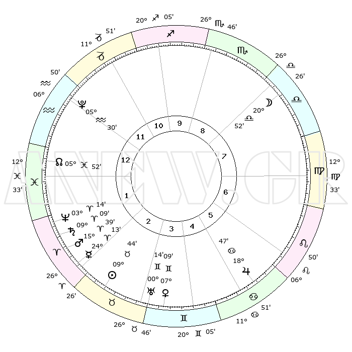 | | ΘΕΣΕΙΣ ΠΛΑΝΗΤΩΝ ΑΣΤΡΟΛΟΓΙΚΟΥ ΧΑΡΤΗ ΤΗΣ ΣΤΙΓΜΗΣ ΑΥΤΗΣ | | | | Πλανήτης | Ζώδιο | Μοίρες | Δεκαήμ. | Σε οίκο | Απόκλιση | | Ακμές των οίκων | | Ηλιος | Ταύρος | 09°41' | Πρώτο | 3 | 14 N 43 | | 1ος | 15°54' | Υδροχόος | | Σελήνη | Ζυγός | 20°15' | Τρίτο | 8 | 11 S 07 | | 2ος | 01°38' | Κριός | | Ερμής | Κριός | 24°08' | Τρίτο | 2 | 07 N 28 | | 3ος | 07°10' | Ταύρος | | Αφροδίτη | Δίδυμοι | 07°05' | Πρώτο | 4 | 22 N 20 | | 4ος | 03°12' | Δίδυμοι | | Αρης | Κριός | 15°37' | Δεύτερο | 2 | 05 N 19 | | 5ος | 25°08' | Δίδυμοι | | Δίας | Καρκίνος | 18°47' | Δεύτερο | 6 | 22 N 30 | | 6ος | 17°26' | Καρκίνος | | Κρόνος | Κριός | 09°09' | Πρώτο | 2 | 01 N 38 | | 7ος | 15°54' | Λέων | | Ουρανός | Δίδυμοι | 00°13' | Πρώτο | 3 | 20 N 02 | | 8ος | 01°38' | Ζυγός | | Ποσειδώνας | Κριός | 03°14' | Πρώτο | 2 | 00 N 04 | | 9ος | 07°10' | Σκορπιός | | Πλούτωνας | Υδροχόος | 05°30' | Πρώτο | 12 | 22 S 49 | | 10ος | 03°12' | Τοξότης | | Β. Δεσμός | Ιχθείς | 05°52' | Πρώτο | 1 | 09 S 21 | | 11ος | 25°08' | Τοξότης | | Ωροσκόπος | Υδροχόος | 15°54' | Δεύτερο | | | 12ος | 17°26' | Αιγόκερως | | Μεσουράνημα | Τοξότης | 03°12' | Πρώτο | | | |