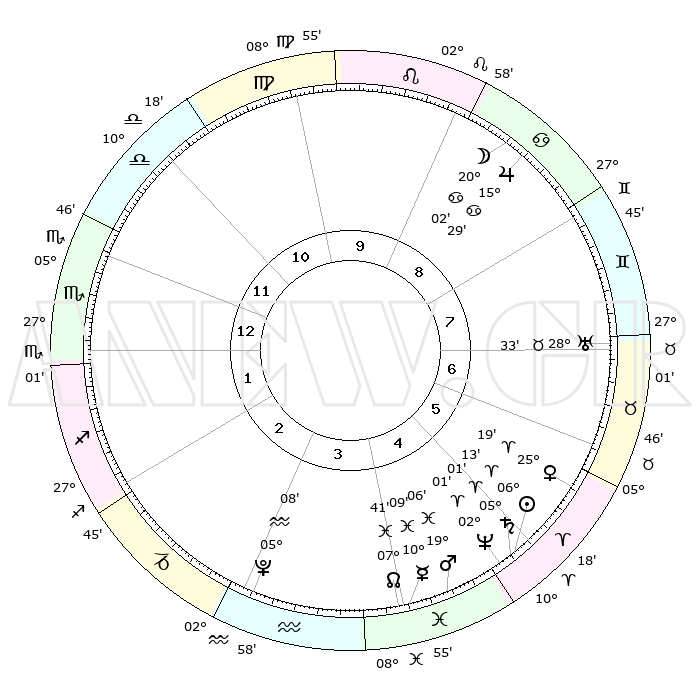 | | ΘΕΣΕΙΣ ΠΛΑΝΗΤΩΝ ΑΣΤΡΟΛΟΓΙΚΟΥ ΧΑΡΤΗ ΤΗΣ ΣΤΙΓΜΗΣ ΑΥΤΗΣ | | | | Πλανήτης | Ζώδιο | Μοίρες | Δεκαήμ. | Σε οίκο | Απόκλιση | | Ακμές των οίκων | | Ηλιος | Κριός | 06°08' | Πρώτο | 5 | 02 N 26 | | 1ος | 07°17' | Σκορπιός | | Σελήνη | Καρκίνος | 19°05' | Δεύτερο | 9 | 26 N 01 | | 2ος | 06°10' | Τοξότης | | Ερμής | Ιχθείς | 10°07' | Δεύτερο | 4 | 08 S 07 | | 3ος | 08°47' | Αιγόκερως | | Αφροδίτη | Κριός | 25°14' | Τρίτο | 6 | 09 N 10 | | 4ος | 13°29' | Υδροχόος | | Αρης | Ιχθείς | 19°03' | Δεύτερο | 5 | 05 S 18 | | 5ος | 16°15' | Ιχθείς | | Δίας | Καρκίνος | 15°29' | Δεύτερο | 9 | 22 N 54 | | 6ος | 14°12' | Κριός | | Κρόνος | Κριός | 05°01' | Πρώτο | 5 | 00 N 02 | | 7ος | 07°17' | Ταύρος | | Ουρανός | Ταύρος | 28°33' | Τρίτο | 7 | 19 N 40 | | 8ος | 06°10' | Δίδυμοι | | Ποσειδώνας | Κριός | 02°01' | Πρώτο | 5 | 00 S 24 | | 9ος | 08°47' | Καρκίνος | | Πλούτωνας | Υδροχόος | 05°08' | Πρώτο | 3 | 22 S 48 | | 10ος | 13°29' | Λέων | | Β. Δεσμός | Ιχθείς | 07°41' | Πρώτο | 4 | 08 S 41 | | 11ος | 16°15' | Παρθένος | | Ωροσκόπος | Σκορπιός | 07°17' | Πρώτο | | | 12ος | 14°12' | Ζυγός | | Μεσουράνημα | Λέων | 13°29' | Δεύτερο | | | |