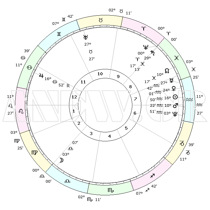 | | ΘΕΣΕΙΣ ΠΛΑΝΗΤΩΝ ΑΣΤΡΟΛΟΓΙΚΟΥ ΧΑΡΤΗ ΤΗΣ ΣΤΙΓΜΗΣ ΑΥΤΗΣ | | | | Πλανήτης | Ζώδιο | Μοίρες | Δεκαήμ. | Σε οίκο | Απόκλιση | | Ακμές των οίκων | | Ηλιος | Υδροχόος | 16°47' | Δεύτερο | 8 | 15 S 48 | | 1ος | 25°03' | Καρκίνος | | Σελήνη | Ζυγός | 02°24' | Πρώτο | 3 | 02 S 52 | | 2ος | 15°47' | Λέων | | Ερμής | Υδροχόος | 27°36' | Τρίτο | 8 | 13 S 42 | | 3ος | 10°11' | Παρθένος | | Αφροδίτη | Υδροχόος | 23°56' | Τρίτο | 8 | 14 S 53 | | 4ος | 10°33' | Ζυγός | | Αρης | Υδροχόος | 10°20' | Δεύτερο | 7 | 18 S 40 | | 5ος | 16°38' | Σκορπιός | | Δίας | Καρκίνος | 16°52'R | Δεύτερο | 12 | 22 N 41 | | 6ος | 23°11' | Τοξότης | | Κρόνος | Ιχθείς | 29°13' | Τρίτο | 9 | 02 S 18 | | 7ος | 25°03' | Αιγόκερως | | Ουρανός | Ταύρος | 27°27' | Τρίτο | 11 | 19 N 24 | | 8ος | 15°47' | Υδροχόος | | Ποσειδώνας | Κριός | 00°16' | Πρώτο | 9 | 01 S 06 | | 9ος | 10°11' | Ιχθείς | | Πλούτωνας | Υδροχόος | 03°51' | Πρώτο | 7 | 23 S 00 | | 10ος | 10°33' | Κριός | | Β. Δεσμός | Ιχθείς | 10°17' | Δεύτερο | 9 | 07 S 43 | | 11ος | 16°38' | Ταύρος | | Ωροσκόπος | Καρκίνος | 25°03' | Τρίτο | | | 12ος | 23°11' | Δίδυμοι | | Μεσουράνημα | Κριός | 10°33' | Δεύτερο | | | |