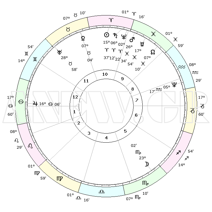 | | ΘΕΣΕΙΣ ΠΛΑΝΗΤΩΝ ΑΣΤΡΟΛΟΓΙΚΟΥ ΧΑΡΤΗ ΤΗΣ ΣΤΙΓΜΗΣ ΑΥΤΗΣ | | | | Πλανήτης | Ζώδιο | Μοίρες | Δεκαήμ. | Σε οίκο | Απόκλιση | | Ακμές των οίκων | | Ηλιος | Κριός | 15°07' | Δεύτερο | 4 | 05 N 57 | | 1ος | 11°52' | Τοξότης | | Σελήνη | Σκορπιός | 16°56' | Δεύτερο | 11 | 21 S 30 | | 2ος | 14°56' | Αιγόκερως | | Ερμής | Ιχθείς | 17°23' | Δεύτερο | 3 | 06 S 41 | | 3ος | 22°38' | Υδροχόος | | Αφροδίτη | Ταύρος | 06°26' | Πρώτο | 5 | 13 N 24 | | 4ος | 28°33' | Ιχθείς | | Αρης | Ιχθείς | 26°10' | Τρίτο | 3 | 02 S 28 | | 5ος | 27°52' | Κριός | | Δίας | Καρκίνος | 16°03' | Δεύτερο | 8 | 22 N 50 | | 6ος | 21°23' | Ταύρος | | Κρόνος | Κριός | 06°09' | Πρώτο | 4 | 00 N 29 | | 7ος | 11°52' | Δίδυμοι | | Ουρανός | Ταύρος | 28°56' | Τρίτο | 6 | 19 N 45 | | 8ος | 14°56' | Καρκίνος | | Ποσειδώνας | Κριός | 02°21' | Πρώτο | 4 | 00 S 16 | | 9ος | 22°38' | Λέων | | Πλούτωνας | Υδροχόος | 05°17' | Πρώτο | 2 | 22 S 47 | | 10ος | 28°33' | Παρθένος | | Β. Δεσμός | Ιχθείς | 07°12' | Πρώτο | 3 | 08 S 52 | | 11ος | 27°52' | Ζυγός | | Ωροσκόπος | Τοξότης | 11°52' | Δεύτερο | | | 12ος | 21°23' | Σκορπιός | | Μεσουράνημα | Παρθένος | 28°33' | Τρίτο | | | |