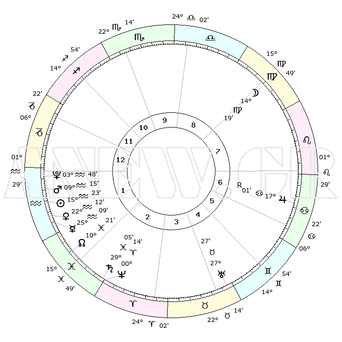 | | ΘΕΣΕΙΣ ΠΛΑΝΗΤΩΝ ΑΣΤΡΟΛΟΓΙΚΟΥ ΧΑΡΤΗ ΤΗΣ ΣΤΙΓΜΗΣ ΑΥΤΗΣ | | | | Πλανήτης | Ζώδιο | Μοίρες | Δεκαήμ. | Σε οίκο | Απόκλιση | | Ακμές των οίκων | | Ηλιος | Υδροχόος | 15°19' | Δεύτερο | 1 | 16 S 14 | | 1ος | 12°01' | Αιγόκερως | | Σελήνη | Παρθένος | 13°40' | Δεύτερο | 8 | 06 N 02 | | 2ος | 22°15' | Υδροχόος | | Ερμής | Υδροχόος | 25°04' | Τρίτο | 2 | 14 S 43 | | 3ος | 02°29' | Κριός | | Αφροδίτη | Υδροχόος | 22°08' | Τρίτο | 1 | 15 S 27 | | 4ος | 04°17' | Ταύρος | | Αρης | Υδροχόος | 09°12' | Πρώτο | 1 | 18 S 58 | | 5ος | 28°52' | Ταύρος | | Δίας | Καρκίνος | 17°01'R | Δεύτερο | 7 | 22 N 39 | | 6ος | 20°09' | Δίδυμοι | | Κρόνος | Ιχθείς | 29°04' | Τρίτο | 2 | 02 S 21 | | 7ος | 12°01' | Καρκίνος | | Ουρανός | Ταύρος | 27°27' | Τρίτο | 4 | 19 N 24 | | 8ος | 22°15' | Λέων | | Ποσειδώνας | Κριός | 00°14' | Πρώτο | 2 | 01 S 07 | | 9ος | 02°29' | Ζυγός | | Πλούτωνας | Υδροχόος | 03°48' | Πρώτο | 1 | 23 S 00 | | 10ος | 04°17' | Σκορπιός | | Β. Δεσμός | Ιχθείς | 10°22' | Δεύτερο | 2 | 07 S 41 | | 11ος | 28°52' | Σκορπιός | | Ωροσκόπος | Αιγόκερως | 12°01' | Δεύτερο | | | 12ος | 20°09' | Τοξότης | | Μεσουράνημα | Σκορπιός | 04°17' | Πρώτο | | | |