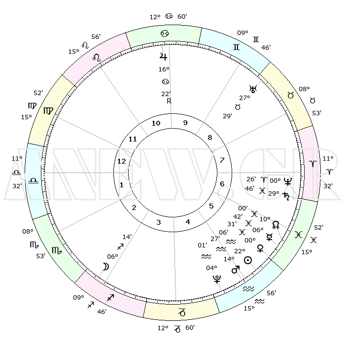 | | ΘΕΣΕΙΣ ΠΛΑΝΗΤΩΝ ΑΣΤΡΟΛΟΓΙΚΟΥ ΧΑΡΤΗ ΤΗΣ ΣΤΙΓΜΗΣ ΑΥΤΗΣ | | | | Πλανήτης | Ζώδιο | Μοίρες | Δεκαήμ. | Σε οίκο | Απόκλιση | | Ακμές των οίκων | | Ηλιος | Υδροχόος | 22°02' | Τρίτο | 5 | 14 S 10 | | 1ος | 24°32' | Παρθένος | | Σελήνη | Τοξότης | 05°33' | Πρώτο | 3 | 26 S 23 | | 2ος | 20°42' | Ζυγός | | Ερμής | Ιχθείς | 06°36' | Πρώτο | 6 | 09 S 49 | | 3ος | 20°55' | Σκορπιός | | Αφροδίτη | Ιχθείς | 00°27' | Πρώτο | 6 | 12 S 41 | | 4ος | 23°51' | Τοξότης | | Αρης | Υδροχόος | 14°24' | Δεύτερο | 5 | 17 S 32 | | 5ος | 26°56' | Αιγόκερως | | Δίας | Καρκίνος | 16°22'R | Δεύτερο | 10 | 22 N 45 | | 6ος | 27°34' | Υδροχόος | | Κρόνος | Ιχθείς | 29°46' | Τρίτο | 7 | 02 S 04 | | 7ος | 24°32' | Ιχθείς | | Ουρανός | Ταύρος | 27°29' | Τρίτο | 9 | 19 N 25 | | 8ος | 20°42' | Κριός | | Ποσειδώνας | Κριός | 00°26' | Πρώτο | 7 | 01 S 02 | | 9ος | 20°55' | Ταύρος | | Πλούτωνας | Υδροχόος | 04°00' | Πρώτο | 5 | 22 S 58 | | 10ος | 23°51' | Δίδυμοι | | Β. Δεσμός | Ιχθείς | 10°01' | Δεύτερο | 6 | 07 S 49 | | 11ος | 26°56' | Καρκίνος | | Ωροσκόπος | Παρθένος | 24°32' | Τρίτο | | | 12ος | 27°34' | Λέων | | Μεσουράνημα | Δίδυμοι | 23°51' | Τρίτο | | | |