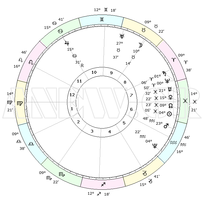 | | ΘΕΣΕΙΣ ΠΛΑΝΗΤΩΝ ΑΣΤΡΟΛΟΓΙΚΟΥ ΧΑΡΤΗ ΤΗΣ ΣΤΙΓΜΗΣ ΑΥΤΗΣ | | | | Πλανήτης | Ζώδιο | Μοίρες | Δεκαήμ. | Σε οίκο | Απόκλιση | | Ακμές των οίκων | | Ηλιος | Ιχθείς | 04°00' | Πρώτο | 7 | 10 S 02 | | 1ος | 21°40' | Λέων | | Σελήνη | Ταύρος | 09°08' | Πρώτο | 9 | 18 N 53 | | 2ος | 14°39' | Παρθένος | | Ερμής | Ιχθείς | 21°29' | Τρίτο | 8 | 01 S 37 | | 3ος | 12°29' | Ζυγός | | Αφροδίτη | Ιχθείς | 15°17' | Δεύτερο | 8 | 07 S 07 | | 4ος | 15°13' | Σκορπιός | | Αρης | Υδροχόος | 23°44' | Τρίτο | 7 | 14 S 38 | | 5ος | 19°60' | Τοξότης | | Δίας | Καρκίνος | 15°32'R | Δεύτερο | 11 | 22 N 52 | | 6ος | 22°43' | Αιγόκερως | | Κρόνος | Κριός | 01°05' | Πρώτο | 8 | 01 S 32 | | 7ος | 21°40' | Υδροχόος | | Ουρανός | Ταύρος | 27°37' | Τρίτο | 10 | 19 N 27 | | 8ος | 14°39' | Ιχθείς | | Ποσειδώνας | Κριός | 00°49' | Πρώτο | 8 | 00 S 52 | | 9ος | 12°29' | Κριός | | Πλούτωνας | Υδροχόος | 04°22' | Πρώτο | 6 | 22 S 54 | | 10ος | 15°13' | Ταύρος | | Β. Δεσμός | Ιχθείς | 09°23' | Πρώτο | 7 | 08 S 03 | | 11ος | 19°60' | Δίδυμοι | | Ωροσκόπος | Λέων | 21°40' | Τρίτο | | | 12ος | 22°43' | Καρκίνος | | Μεσουράνημα | Ταύρος | 15°13' | Δεύτερο | | | |