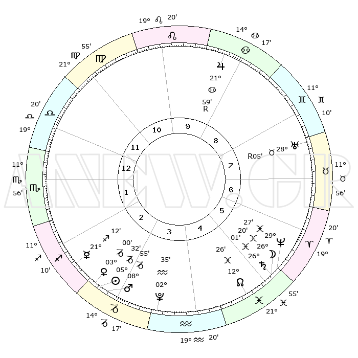 | | ΘΕΣΕΙΣ ΠΛΑΝΗΤΩΝ ΑΣΤΡΟΛΟΓΙΚΟΥ ΧΑΡΤΗ ΤΗΣ ΣΤΙΓΜΗΣ ΑΥΤΗΣ | | | | Πλανήτης | Ζώδιο | Μοίρες | Δεκαήμ. | Σε οίκο | Απόκλιση | | Ακμές των οίκων | | Ηλιος | Αιγόκερως | 05°27' | Πρώτο | 3 | 23 S 19 | | 1ος | 19°06' | Ζυγός | | Σελήνη | Ιχθείς | 25°17' | Τρίτο | 6 | 00 S 45 | | 2ος | 16°53' | Σκορπιός | | Ερμής | Τοξότης | 21°05' | Τρίτο | 3 | 23 S 07 | | 3ος | 18°08' | Τοξότης | | Αφροδίτη | Αιγόκερως | 02°54' | Πρώτο | 3 | 23 S 43 | | 4ος | 21°41' | Αιγόκερως | | Αρης | Αιγόκερως | 08°52' | Πρώτο | 3 | 24 S 00 | | 5ος | 24°38' | Υδροχόος | | Δίας | Καρκίνος | 21°60'R | Τρίτο | 10 | 21 N 52 | | 6ος | 24°08' | Ιχθείς | | Κρόνος | Ιχθείς | 26°01' | Τρίτο | 6 | 03 S 40 | | 7ος | 19°06' | Κριός | | Ουρανός | Ταύρος | 28°05'R | Τρίτο | 8 | 19 N 32 | | 8ος | 16°53' | Ταύρος | | Ποσειδώνας | Ιχθείς | 29°27' | Τρίτο | 6 | 01 S 27 | | 9ος | 18°08' | Δίδυμοι | | Πλούτωνας | Υδροχόος | 02°34' | Πρώτο | 4 | 23 S 15 | | 10ος | 21°41' | Καρκίνος | | Β. Δεσμός | Ιχθείς | 12°26' | Δεύτερο | 5 | 06 S 54 | | 11ος | 24°38' | Λέων | | Ωροσκόπος | Ζυγός | 19°06' | Δεύτερο | | | 12ος | 24°08' | Παρθένος | | Μεσουράνημα | Καρκίνος | 21°41' | Τρίτο | | | |