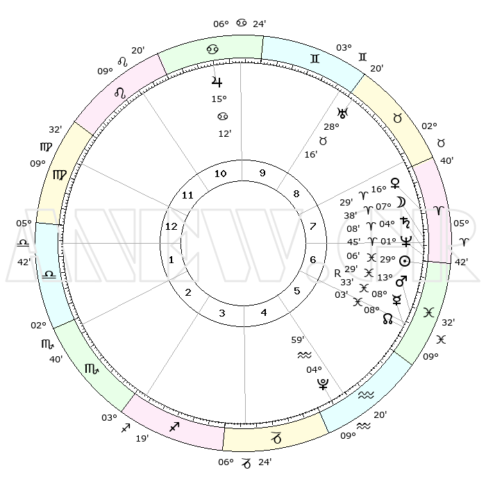 | | ΘΕΣΕΙΣ ΠΛΑΝΗΤΩΝ ΑΣΤΡΟΛΟΓΙΚΟΥ ΧΑΡΤΗ ΤΗΣ ΣΤΙΓΜΗΣ ΑΥΤΗΣ | | | | Πλανήτης | Ζώδιο | Μοίρες | Δεκαήμ. | Σε οίκο | Απόκλιση | | Ακμές των οίκων | | Ηλιος | Ιχθείς | 29°02' | Τρίτο | 7 | 00 S 23 | | 1ος | 15°38' | Παρθένος | | Σελήνη | Κριός | 06°41' | Πρώτο | 7 | 04 N 54 | | 2ος | 11°03' | Ζυγός | | Ερμής | Ιχθείς | 08°34'R | Πρώτο | 6 | 07 S 11 | | 3ος | 10°50' | Σκορπιός | | Αφροδίτη | Κριός | 16°23' | Δεύτερο | 8 | 05 N 37 | | 4ος | 13°46' | Τοξότης | | Αρης | Ιχθείς | 13°26' | Δεύτερο | 6 | 07 S 30 | | 5ος | 17°07' | Αιγόκερως | | Δίας | Καρκίνος | 15°12' | Δεύτερο | 10 | 22 N 56 | | 6ος | 18°07' | Υδροχόος | | Κρόνος | Κριός | 04°07' | Πρώτο | 7 | 00 S 19 | | 7ος | 15°38' | Ιχθείς | | Ουρανός | Ταύρος | 28°16' | Τρίτο | 9 | 19 N 36 | | 8ος | 11°03' | Κριός | | Ποσειδώνας | Κριός | 01°45' | Πρώτο | 7 | 00 S 30 | | 9ος | 10°50' | Ταύρος | | Πλούτωνας | Υδροχόος | 04°59' | Πρώτο | 5 | 22 S 49 | | 10ος | 13°46' | Δίδυμοι | | Β. Δεσμός | Ιχθείς | 08°03' | Πρώτο | 6 | 08 S 33 | | 11ος | 17°07' | Καρκίνος | | Ωροσκόπος | Παρθένος | 15°38' | Δεύτερο | | | 12ος | 18°07' | Λέων | | Μεσουράνημα | Δίδυμοι | 13°46' | Δεύτερο | | | |