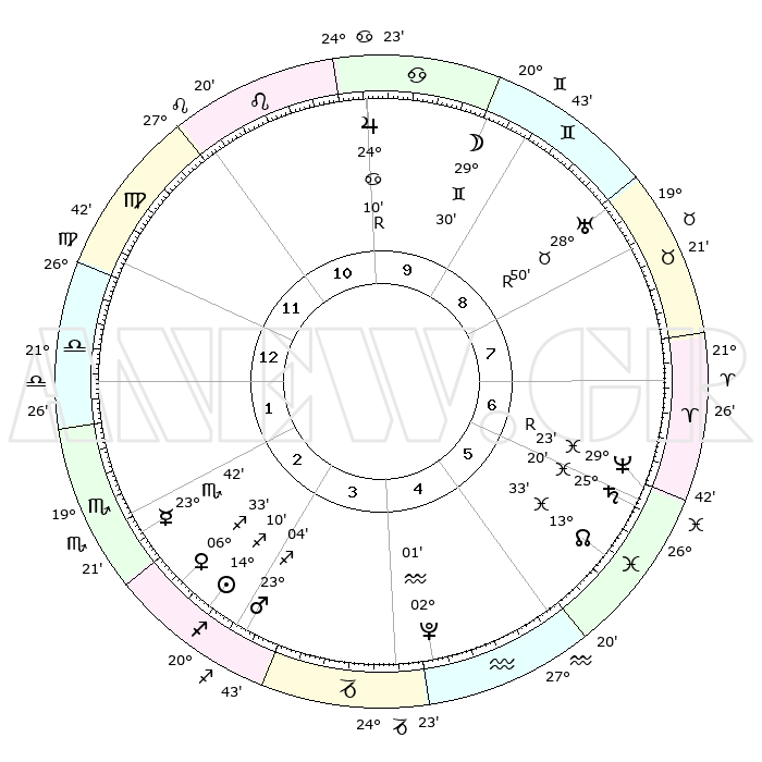 | | ΘΕΣΕΙΣ ΠΛΑΝΗΤΩΝ ΑΣΤΡΟΛΟΓΙΚΟΥ ΧΑΡΤΗ ΤΗΣ ΣΤΙΓΜΗΣ ΑΥΤΗΣ | | | | Πλανήτης | Ζώδιο | Μοίρες | Δεκαήμ. | Σε οίκο | Απόκλιση | | Ακμές των οίκων | | Ηλιος | Τοξότης | 14°07' | Δεύτερο | 3 | 22 S 29 | | 1ος | 10°25' | Ζυγός | | Σελήνη | Δίδυμοι | 28°56' | Τρίτο | 9 | 28 N 15 | | 2ος | 07°42' | Σκορπιός | | Ερμής | Σκορπιός | 23°41' | Τρίτο | 2 | 16 S 17 | | 3ος | 08°32' | Τοξότης | | Αφροδίτη | Τοξότης | 06°31' | Πρώτο | 2 | 20 S 53 | | 4ος | 11°44' | Αιγόκερως | | Αρης | Τοξότης | 23°02' | Τρίτο | 3 | 23 S 57 | | 5ος | 14°40' | Υδροχόος | | Δίας | Καρκίνος | 24°11'R | Τρίτο | 10 | 21 N 26 | | 6ος | 14°39' | Ιχθείς | | Κρόνος | Ιχθείς | 25°20' | Τρίτο | 6 | 04 S 01 | | 7ος | 10°25' | Κριός | | Ουρανός | Ταύρος | 28°51'R | Τρίτο | 8 | 19 N 42 | | 8ος | 07°42' | Ταύρος | | Ποσειδώνας | Ιχθείς | 29°23'R | Τρίτο | 6 | 01 S 29 | | 9ος | 08°32' | Δίδυμοι | | Πλούτωνας | Υδροχόος | 02°01' | Πρώτο | 4 | 23 S 22 | | 10ος | 11°44' | Καρκίνος | | Β. Δεσμός | Ιχθείς | 13°33' | Δεύτερο | 5 | 06 S 28 | | 11ος | 14°40' | Λέων | | Ωροσκόπος | Ζυγός | 10°25' | Δεύτερο | | | 12ος | 14°39' | Παρθένος | | Μεσουράνημα | Καρκίνος | 11°44' | Δεύτερο | | | |