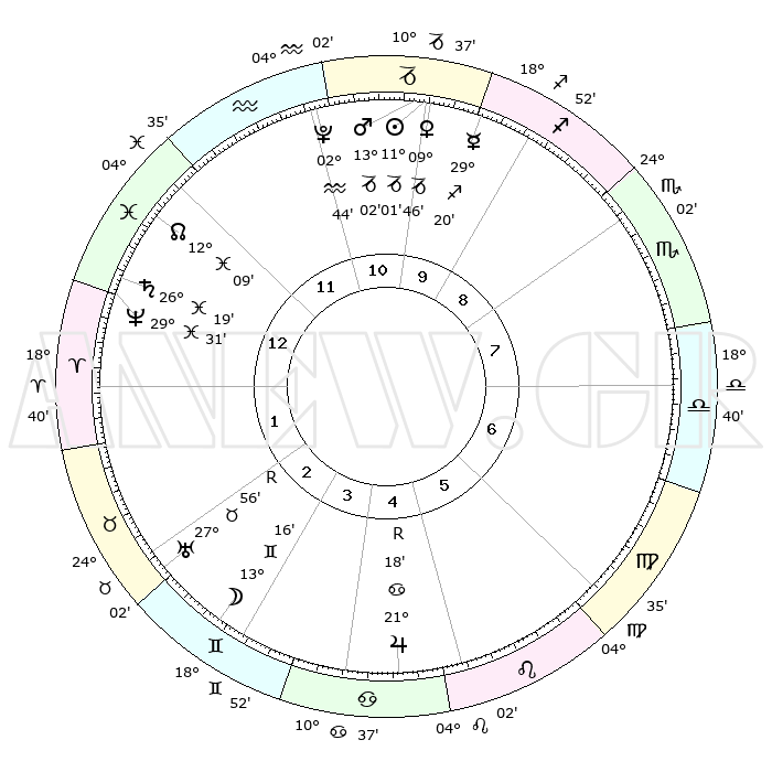 | | ΘΕΣΕΙΣ ΠΛΑΝΗΤΩΝ ΑΣΤΡΟΛΟΓΙΚΟΥ ΧΑΡΤΗ ΤΗΣ ΣΤΙΓΜΗΣ ΑΥΤΗΣ | | | | Πλανήτης | Ζώδιο | Μοίρες | Δεκαήμ. | Σε οίκο | Απόκλιση | | Ακμές των οίκων | | Ηλιος | Αιγόκερως | 10°56' | Δεύτερο | 11 | 22 S 59 | | 1ος | 02°52' | Ιχθείς | | Σελήνη | Δίδυμοι | 12°05' | Δεύτερο | 3 | 27 N 15 | | 2ος | 18°01' | Κριός | | Ερμής | Τοξότης | 29°12' | Τρίτο | 10 | 24 S 02 | | 3ος | 20°11' | Ταύρος | | Αφροδίτη | Αιγόκερως | 09°40' | Πρώτο | 11 | 23 S 36 | | 4ος | 14°18' | Δίδυμοι | | Αρης | Αιγόκερως | 12°58' | Δεύτερο | 11 | 23 S 41 | | 5ος | 05°59' | Καρκίνος | | Δίας | Καρκίνος | 21°18'R | Τρίτο | 5 | 21 N 59 | | 6ος | 29°51' | Καρκίνος | | Κρόνος | Ιχθείς | 26°18' | Τρίτο | 1 | 03 S 32 | | 7ος | 02°52' | Παρθένος | | Ουρανός | Ταύρος | 27°56'R | Τρίτο | 3 | 19 N 30 | | 8ος | 18°02' | Ζυγός | | Ποσειδώνας | Ιχθείς | 29°31' | Τρίτο | 1 | 01 S 25 | | 9ος | 20°11' | Σκορπιός | | Πλούτωνας | Υδροχόος | 02°44' | Πρώτο | 12 | 23 S 13 | | 10ος | 14°18' | Τοξότης | | Β. Δεσμός | Ιχθείς | 12°09' | Δεύτερο | 1 | 07 S 00 | | 11ος | 05°59' | Αιγόκερως | | Ωροσκόπος | Ιχθείς | 02°52' | Πρώτο | | | 12ος | 29°51' | Αιγόκερως | | Μεσουράνημα | Τοξότης | 14°18' | Δεύτερο | | | |