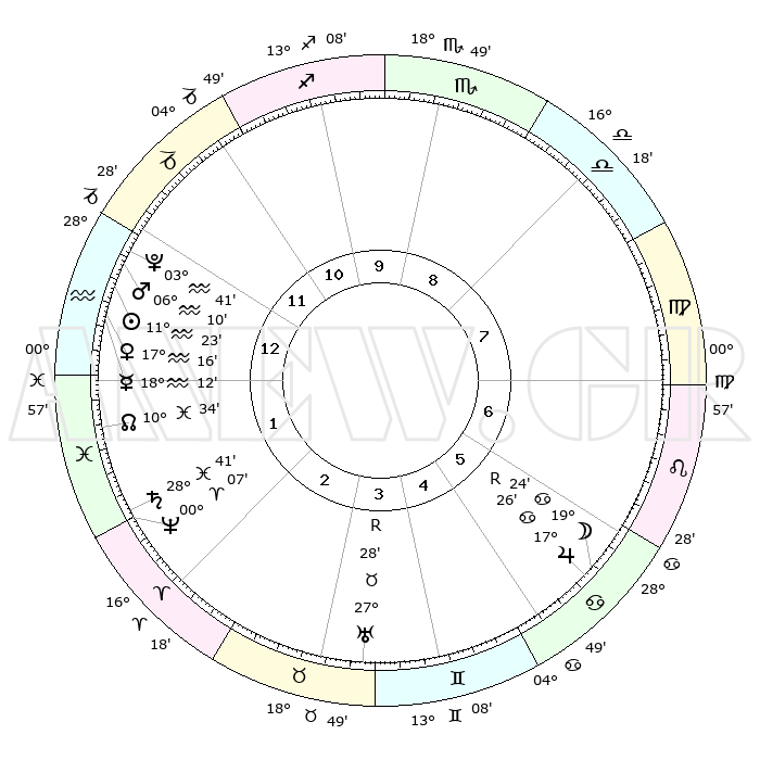 | | ΘΕΣΕΙΣ ΠΛΑΝΗΤΩΝ ΑΣΤΡΟΛΟΓΙΚΟΥ ΧΑΡΤΗ ΤΗΣ ΣΤΙΓΜΗΣ ΑΥΤΗΣ | | | | Πλανήτης | Ζώδιο | Μοίρες | Δεκαήμ. | Σε οίκο | Απόκλιση | | Ακμές των οίκων | | Ηλιος | Υδροχόος | 11°18' | Δεύτερο | 1 | 17 S 23 | | 1ος | 22°22' | Αιγόκερως | | Σελήνη | Καρκίνος | 18°12' | Δεύτερο | 6 | 26 N 13 | | 2ος | 05°01' | Ιχθείς | | Ερμής | Υδροχόος | 18°03' | Δεύτερο | 1 | 17 S 15 | | 3ος | 14°30' | Κριός | | Αφροδίτη | Υδροχόος | 17°10' | Δεύτερο | 1 | 16 S 58 | | 4ος | 14°20' | Ταύρος | | Αρης | Υδροχόος | 06°06' | Πρώτο | 1 | 19 S 45 | | 5ος | 07°45' | Δίδυμοι | | Δίας | Καρκίνος | 17°27'R | Δεύτερο | 6 | 22 N 36 | | 6ος | 28°59' | Δίδυμοι | | Κρόνος | Ιχθείς | 28°41' | Τρίτο | 2 | 02 S 31 | | 7ος | 22°22' | Καρκίνος | | Ουρανός | Ταύρος | 27°28'R | Τρίτο | 4 | 19 N 24 | | 8ος | 05°01' | Παρθένος | | Ποσειδώνας | Κριός | 00°07' | Πρώτο | 2 | 01 S 10 | | 9ος | 14°30' | Ζυγός | | Πλούτωνας | Υδροχόος | 03°41' | Πρώτο | 1 | 23 S 02 | | 10ος | 14°20' | Σκορπιός | | Β. Δεσμός | Ιχθείς | 10°34' | Δεύτερο | 2 | 07 S 36 | | 11ος | 07°45' | Τοξότης | | Ωροσκόπος | Αιγόκερως | 22°22' | Τρίτο | | | 12ος | 28°59' | Τοξότης | | Μεσουράνημα | Σκορπιός | 14°20' | Δεύτερο | | | |
