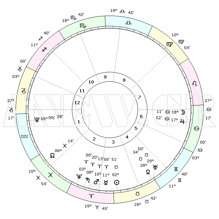 | | ΘΕΣΕΙΣ ΠΛΑΝΗΤΩΝ ΑΣΤΡΟΛΟΓΙΚΟΥ ΧΑΡΤΗ ΤΗΣ ΣΤΙΓΜΗΣ ΑΥΤΗΣ | | | | Πλανήτης | Ζώδιο | Μοίρες | Δεκαήμ. | Σε οίκο | Απόκλιση | | Ακμές των οίκων | | Ηλιος | Ταύρος | 02°47' | Πρώτο | 4 | 12 N 26 | | 1ος | 03°26' | Αιγόκερως | | Σελήνη | Καρκίνος | 17°17' | Δεύτερο | 7 | 26 N 12 | | 2ος | 11°27' | Υδροχόος | | Ερμής | Κριός | 11°50' | Δεύτερο | 3 | 02 N 20 | | 3ος | 21°39' | Ιχθείς | | Αφροδίτη | Ταύρος | 28°29' | Τρίτο | 5 | 20 N 20 | | 4ος | 25°01' | Κριός | | Αρης | Κριός | 10°10' | Δεύτερο | 3 | 03 N 10 | | 5ος | 20°48' | Ταύρος | | Δίας | Καρκίνος | 17°51' | Δεύτερο | 7 | 22 N 37 | | 6ος | 12°24' | Δίδυμοι | | Κρόνος | Κριός | 08°20' | Πρώτο | 3 | 01 N 19 | | 7ος | 03°26' | Καρκίνος | | Ουρανός | Ταύρος | 29°50' | Τρίτο | 5 | 19 N 57 | | 8ος | 11°27' | Λέων | | Ποσειδώνας | Κριός | 02°60' | Πρώτο | 3 | 00 S 01 | | 9ος | 21°39' | Παρθένος | | Πλούτωνας | Υδροχόος | 05°28' | Πρώτο | 1 | 22 S 48 | | 10ος | 25°01' | Ζυγός | | Β. Δεσμός | Ιχθείς | 06°15' | Πρώτο | 2 | 09 S 13 | | 11ος | 20°48' | Σκορπιός | | Ωροσκόπος | Αιγόκερως | 03°26' | Πρώτο | | | 12ος | 12°24' | Τοξότης | | Μεσουράνημα | Ζυγός | 25°01' | Τρίτο | | | |
