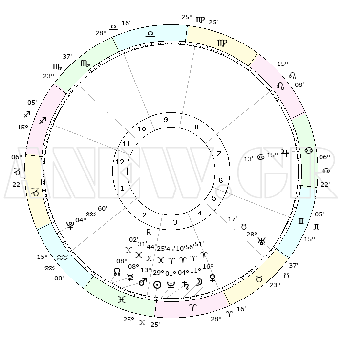| | ΘΕΣΕΙΣ ΠΛΑΝΗΤΩΝ ΑΣΤΡΟΛΟΓΙΚΟΥ ΧΑΡΤΗ ΤΗΣ ΣΤΙΓΜΗΣ ΑΥΤΗΣ | | | | Πλανήτης | Ζώδιο | Μοίρες | Δεκαήμ. | Σε οίκο | Απόκλιση | | Ακμές των οίκων | | Ηλιος | Ιχθείς | 29°20' | Τρίτο | 3 | 00 S 16 | | 1ος | 12°43' | Τοξότης | | Σελήνη | Κριός | 10°53' | Δεύτερο | 4 | 06 N 52 | | 2ος | 15°58' | Αιγόκερως | | Ερμής | Ιχθείς | 08°32'R | Πρώτο | 3 | 07 S 15 | | 3ος | 23°48' | Υδροχόος | | Αφροδίτη | Κριός | 16°46' | Δεύτερο | 4 | 05 N 46 | | 4ος | 29°40' | Ιχθείς | | Αρης | Ιχθείς | 13°40' | Δεύτερο | 3 | 07 S 25 | | 5ος | 28°51' | Κριός | | Δίας | Καρκίνος | 15°13' | Δεύτερο | 7 | 22 N 56 | | 6ος | 22°15' | Ταύρος | | Κρόνος | Κριός | 04°09' | Πρώτο | 4 | 00 S 18 | | 7ος | 12°43' | Δίδυμοι | | Ουρανός | Ταύρος | 28°17' | Τρίτο | 6 | 19 N 36 | | 8ος | 15°58' | Καρκίνος | | Ποσειδώνας | Κριός | 01°45' | Πρώτο | 4 | 00 S 30 | | 9ος | 23°48' | Λέων | | Πλούτωνας | Υδροχόος | 04°60' | Πρώτο | 2 | 22 S 49 | | 10ος | 29°40' | Παρθένος | | Β. Δεσμός | Ιχθείς | 08°03' | Πρώτο | 3 | 08 S 33 | | 11ος | 28°51' | Ζυγός | | Ωροσκόπος | Τοξότης | 12°43' | Δεύτερο | | | 12ος | 22°15' | Σκορπιός | | Μεσουράνημα | Παρθένος | 29°40' | Τρίτο | | | |