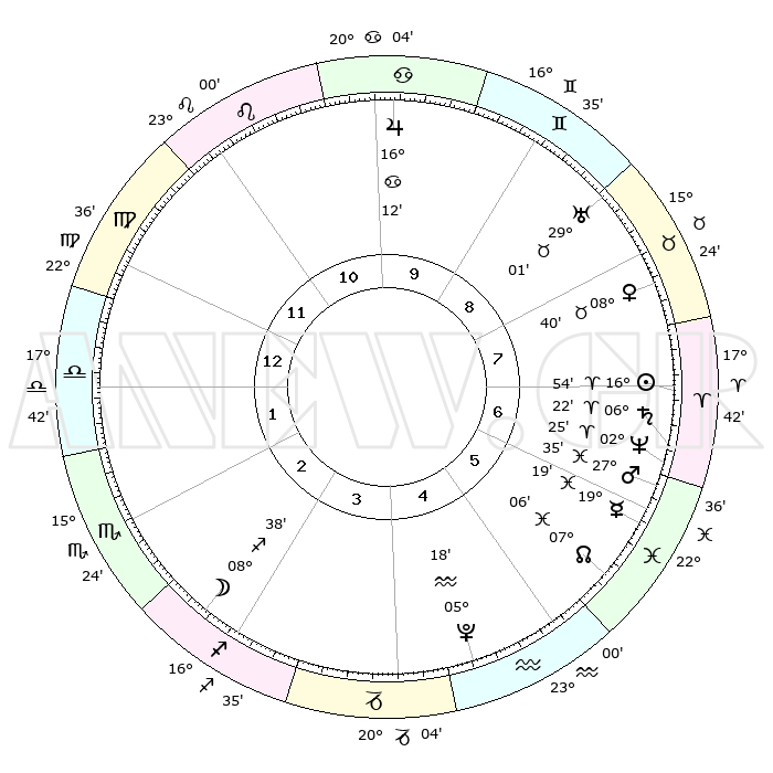 | | ΘΕΣΕΙΣ ΠΛΑΝΗΤΩΝ ΑΣΤΡΟΛΟΓΙΚΟΥ ΧΑΡΤΗ ΤΗΣ ΣΤΙΓΜΗΣ ΑΥΤΗΣ | | | | Πλανήτης | Ζώδιο | Μοίρες | Δεκαήμ. | Σε οίκο | Απόκλιση | | Ακμές των οίκων | | Ηλιος | Κριός | 16°51' | Δεύτερο | 7 | 06 N 37 | | 1ος | 00°07' | Ζυγός | | Σελήνη | Τοξότης | 07°55' | Πρώτο | 3 | 26 S 43 | | 2ος | 26°43' | Ζυγός | | Ερμής | Ιχθείς | 19°15' | Δεύτερο | 6 | 06 S 08 | | 3ος | 27°09' | Σκορπιός | | Αφροδίτη | Ταύρος | 08°35' | Πρώτο | 8 | 14 N 10 | | 4ος | 00°08' | Αιγόκερως | | Αρης | Ιχθείς | 27°32' | Τρίτο | 6 | 01 S 55 | | 5ος | 03°06' | Υδροχόος | | Δίας | Καρκίνος | 16°12' | Δεύτερο | 10 | 22 N 49 | | 6ος | 03°32' | Ιχθείς | | Κρόνος | Κριός | 06°22' | Πρώτο | 7 | 00 N 34 | | 7ος | 00°07' | Κριός | | Ουρανός | Ταύρος | 29°01' | Τρίτο | 9 | 19 N 46 | | 8ος | 26°43' | Κριός | | Ποσειδώνας | Κριός | 02°25' | Πρώτο | 7 | 00 S 14 | | 9ος | 27°09' | Ταύρος | | Πλούτωνας | Υδροχόος | 05°18' | Πρώτο | 5 | 22 S 47 | | 10ος | 00°08' | Καρκίνος | | Β. Δεσμός | Ιχθείς | 07°06' | Πρώτο | 6 | 08 S 54 | | 11ος | 03°06' | Λέων | | Ωροσκόπος | Ζυγός | 00°07' | Πρώτο | | | 12ος | 03°32' | Παρθένος | | Μεσουράνημα | Καρκίνος | 00°08' | Πρώτο | | | |
