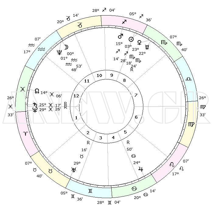 | | ΘΕΣΕΙΣ ΠΛΑΝΗΤΩΝ ΑΣΤΡΟΛΟΓΙΚΟΥ ΧΑΡΤΗ ΤΗΣ ΣΤΙΓΜΗΣ ΑΥΤΗΣ | | | | Πλανήτης | Ζώδιο | Μοίρες | Δεκαήμ. | Σε οίκο | Απόκλιση | | Ακμές των οίκων | | Ηλιος | Τοξότης | 03°23' | Πρώτο | 10 | 20 S 50 | | 1ος | 11°46' | Υδροχόος | | Σελήνη | Αιγόκερως | 29°52' | Τρίτο | 12 | 23 S 37 | | 2ος | 27°17' | Ιχθείς | | Ερμής | Σκορπιός | 22°28'R | Τρίτο | 9 | 16 S 29 | | 3ος | 03°38' | Ταύρος | | Αφροδίτη | Σκορπιός | 23°12' | Τρίτο | 9 | 17 S 42 | | 4ος | 00°14' | Δίδυμοι | | Αρης | Τοξότης | 15°11' | Δεύτερο | 10 | 23 S 13 | | 5ος | 22°19' | Δίδυμοι | | Δίας | Καρκίνος | 24°50'R | Τρίτο | 6 | 21 N 18 | | 6ος | 14°20' | Καρκίνος | | Κρόνος | Ιχθείς | 25°17'R | Τρίτο | 1 | 04 S 04 | | 7ος | 11°47' | Λέων | | Ουρανός | Ταύρος | 29°17'R | Τρίτο | 3 | 19 N 47 | | 8ος | 27°17' | Παρθένος | | Ποσειδώνας | Ιχθείς | 29°26'R | Τρίτο | 2 | 01 S 28 | | 9ος | 03°38' | Σκορπιός | | Πλούτωνας | Υδροχόος | 01°47' | Πρώτο | 12 | 23 S 26 | | 10ος | 00°14' | Τοξότης | | Β. Δεσμός | Ιχθείς | 14°06' | Δεύτερο | 1 | 06 S 15 | | 11ος | 22°19' | Τοξότης | | Ωροσκόπος | Υδροχόος | 11°46' | Δεύτερο | | | 12ος | 14°20' | Αιγόκερως | | Μεσουράνημα | Τοξότης | 00°14' | Πρώτο | | | |
