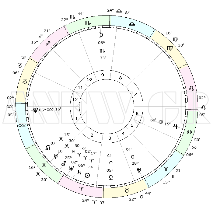 | | ΘΕΣΕΙΣ ΠΛΑΝΗΤΩΝ ΑΣΤΡΟΛΟΓΙΚΟΥ ΧΑΡΤΗ ΤΗΣ ΣΤΙΓΜΗΣ ΑΥΤΗΣ | | | | Πλανήτης | Ζώδιο | Μοίρες | Δεκαήμ. | Σε οίκο | Απόκλιση | | Ακμές των οίκων | | Ηλιος | Κριός | 14°13' | Δεύτερο | 3 | 05 N 36 | | 1ος | 09°31' | Αιγόκερως | | Σελήνη | Σκορπιός | 05°50' | Πρώτο | 10 | 17 S 34 | | 2ος | 19°07' | Υδροχόος | | Ερμής | Ιχθείς | 16°27' | Δεύτερο | 2 | 06 S 56 | | 3ος | 29°25' | Ιχθείς | | Αφροδίτη | Ταύρος | 05°19' | Πρώτο | 4 | 13 N 00 | | 4ος | 01°41' | Ταύρος | | Αρης | Ιχθείς | 25°27' | Τρίτο | 2 | 02 S 45 | | 5ος | 26°35' | Ταύρος | | Δίας | Καρκίνος | 15°59' | Δεύτερο | 7 | 22 N 51 | | 6ος | 17°56' | Δίδυμοι | | Κρόνος | Κριός | 06°02' | Πρώτο | 3 | 00 N 26 | | 7ος | 09°32' | Καρκίνος | | Ουρανός | Ταύρος | 28°54' | Τρίτο | 5 | 19 N 44 | | 8ος | 19°07' | Λέων | | Ποσειδώνας | Κριός | 02°19' | Πρώτο | 3 | 00 S 17 | | 9ος | 29°25' | Παρθένος | | Πλούτωνας | Υδροχόος | 05°16' | Πρώτο | 1 | 22 S 47 | | 10ος | 01°41' | Σκορπιός | | Β. Δεσμός | Ιχθείς | 07°15' | Πρώτο | 2 | 08 S 51 | | 11ος | 26°35' | Σκορπιός | | Ωροσκόπος | Αιγόκερως | 09°31' | Πρώτο | | | 12ος | 17°56' | Τοξότης | | Μεσουράνημα | Σκορπιός | 01°41' | Πρώτο | | | |