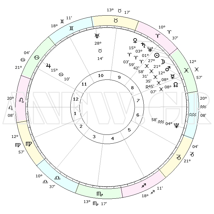 | | ΘΕΣΕΙΣ ΠΛΑΝΗΤΩΝ ΑΣΤΡΟΛΟΓΙΚΟΥ ΧΑΡΤΗ ΤΗΣ ΣΤΙΓΜΗΣ ΑΥΤΗΣ | | | | Πλανήτης | Ζώδιο | Μοίρες | Δεκαήμ. | Σε οίκο | Απόκλιση | | Ακμές των οίκων | | Ηλιος | Ιχθείς | 27°53' | Τρίτο | 9 | 00 S 50 | | 1ος | 29°23' | Καρκίνος | | Σελήνη | Ιχθείς | 20°32' | Τρίτο | 9 | 02 S 47 | | 2ος | 20°22' | Λέων | | Ερμής | Ιχθείς | 08°46'R | Πρώτο | 8 | 06 S 50 | | 3ος | 15°20' | Παρθένος | | Αφροδίτη | Κριός | 14°57' | Δεύτερο | 9 | 05 N 01 | | 4ος | 16°18' | Ζυγός | | Αρης | Ιχθείς | 12°31' | Δεύτερο | 8 | 07 S 51 | | 5ος | 22°21' | Σκορπιός | | Δίας | Καρκίνος | 15°10' | Δεύτερο | 12 | 22 N 56 | | 6ος | 28°10' | Τοξότης | | Κρόνος | Κριός | 03°59' | Πρώτο | 9 | 00 S 22 | | 7ος | 29°23' | Αιγόκερως | | Ουρανός | Ταύρος | 28°14' | Τρίτο | 11 | 19 N 35 | | 8ος | 20°22' | Υδροχόος | | Ποσειδώνας | Κριός | 01°42' | Πρώτο | 9 | 00 S 31 | | 9ος | 15°20' | Ιχθείς | | Πλούτωνας | Υδροχόος | 04°58' | Πρώτο | 7 | 22 S 49 | | 10ος | 16°18' | Κριός | | Β. Δεσμός | Ιχθείς | 08°07' | Πρώτο | 8 | 08 S 31 | | 11ος | 22°21' | Ταύρος | | Ωροσκόπος | Καρκίνος | 29°23' | Τρίτο | | | 12ος | 28°10' | Δίδυμοι | | Μεσουράνημα | Κριός | 16°18' | Δεύτερο | | | |