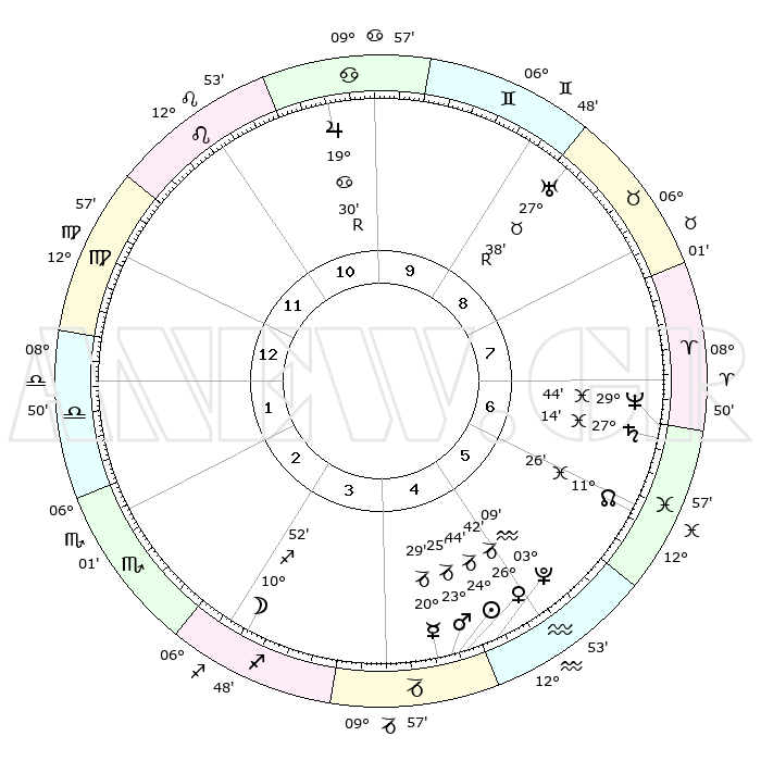 | | ΘΕΣΕΙΣ ΠΛΑΝΗΤΩΝ ΑΣΤΡΟΛΟΓΙΚΟΥ ΧΑΡΤΗ ΤΗΣ ΣΤΙΓΜΗΣ ΑΥΤΗΣ | | | | Πλανήτης | Ζώδιο | Μοίρες | Δεκαήμ. | Σε οίκο | Απόκλιση | | Ακμές των οίκων | | Ηλιος | Αιγόκερως | 24°39' | Τρίτο | 5 | 21 S 11 | | 1ος | 15°06' | Παρθένος | | Σελήνη | Τοξότης | 09°54' | Πρώτο | 3 | 27 S 00 | | 2ος | 10°27' | Ζυγός | | Ερμής | Αιγόκερως | 20°21' | Τρίτο | 5 | 23 S 39 | | 3ος | 10°13' | Σκορπιός | | Αφροδίτη | Αιγόκερως | 26°36' | Τρίτο | 5 | 21 S 47 | | 4ος | 13°09' | Τοξότης | | Αρης | Αιγόκερως | 23°21' | Τρίτο | 5 | 22 S 22 | | 5ος | 16°31' | Αιγόκερως | | Δίας | Καρκίνος | 19°30'R | Δεύτερο | 11 | 22 N 17 | | 6ος | 17°33' | Υδροχόος | | Κρόνος | Ιχθείς | 27°14' | Τρίτο | 7 | 03 S 08 | | 7ος | 15°06' | Ιχθείς | | Ουρανός | Ταύρος | 27°38'R | Τρίτο | 9 | 19 N 26 | | 8ος | 10°27' | Κριός | | Ποσειδώνας | Ιχθείς | 29°44' | Τρίτο | 7 | 01 S 19 | | 9ος | 10°13' | Ταύρος | | Πλούτωνας | Υδροχόος | 03°09' | Πρώτο | 5 | 23 S 08 | | 10ος | 13°09' | Δίδυμοι | | Β. Δεσμός | Ιχθείς | 11°26' | Δεύτερο | 6 | 07 S 16 | | 11ος | 16°31' | Καρκίνος | | Ωροσκόπος | Παρθένος | 15°06' | Δεύτερο | | | 12ος | 17°33' | Λέων | | Μεσουράνημα | Δίδυμοι | 13°09' | Δεύτερο | | | |