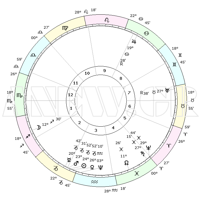 | | ΘΕΣΕΙΣ ΠΛΑΝΗΤΩΝ ΑΣΤΡΟΛΟΓΙΚΟΥ ΧΑΡΤΗ ΤΗΣ ΣΤΙΓΜΗΣ ΑΥΤΗΣ | | | | Πλανήτης | Ζώδιο | Μοίρες | Δεκαήμ. | Σε οίκο | Απόκλιση | | Ακμές των οίκων | | Ηλιος | Αιγόκερως | 24°49' | Τρίτο | 3 | 21 S 10 | | 1ος | 01°00' | Σκορπιός | | Σελήνη | Τοξότης | 11°46' | Δεύτερο | 2 | 27 S 16 | | 2ος | 29°29' | Σκορπιός | | Ερμής | Αιγόκερως | 20°36' | Τρίτο | 3 | 23 S 37 | | 3ος | 01°31' | Αιγόκερως | | Αφροδίτη | Αιγόκερως | 26°48' | Τρίτο | 3 | 21 S 45 | | 4ος | 05°46' | Υδροχόος | | Αρης | Αιγόκερως | 23°28' | Τρίτο | 3 | 22 S 21 | | 5ος | 08°41' | Ιχθείς | | Δίας | Καρκίνος | 19°29'R | Δεύτερο | 9 | 22 N 17 | | 6ος | 07°15' | Κριός | | Κρόνος | Ιχθείς | 27°15' | Τρίτο | 5 | 03 S 08 | | 7ος | 01°00' | Ταύρος | | Ουρανός | Ταύρος | 27°38'R | Τρίτο | 7 | 19 N 26 | | 8ος | 29°29' | Ταύρος | | Ποσειδώνας | Ιχθείς | 29°44' | Τρίτο | 5 | 01 S 19 | | 9ος | 01°31' | Καρκίνος | | Πλούτωνας | Υδροχόος | 03°09' | Πρώτο | 3 | 23 S 08 | | 10ος | 05°46' | Λέων | | Β. Δεσμός | Ιχθείς | 11°26' | Δεύτερο | 5 | 07 S 17 | | 11ος | 08°41' | Παρθένος | | Ωροσκόπος | Σκορπιός | 01°00' | Πρώτο | | | 12ος | 07°15' | Ζυγός | | Μεσουράνημα | Λέων | 05°46' | Πρώτο | | | |