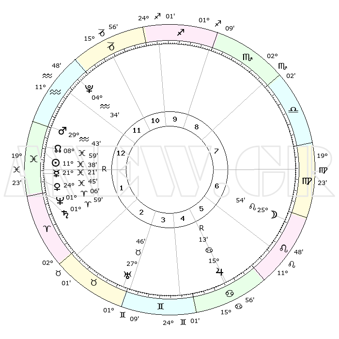 | | ΘΕΣΕΙΣ ΠΛΑΝΗΤΩΝ ΑΣΤΡΟΛΟΓΙΚΟΥ ΧΑΡΤΗ ΤΗΣ ΣΤΙΓΜΗΣ ΑΥΤΗΣ | | | | Πλανήτης | Ζώδιο | Μοίρες | Δεκαήμ. | Σε οίκο | Απόκλιση | | Ακμές των οίκων | | Ηλιος | Ιχθείς | 11°34' | Δεύτερο | 1 | 07 S 13 | | 1ος | 11°54' | Υδροχόος | | Σελήνη | Λέων | 24°57' | Τρίτο | 7 | 14 N 25 | | 2ος | 27°25' | Ιχθείς | | Ερμής | Ιχθείς | 21°23'R | Τρίτο | 1 | 00 S 14 | | 3ος | 03°45' | Ταύρος | | Αφροδίτη | Ιχθείς | 24°40' | Τρίτο | 1 | 03 S 21 | | 4ος | 00°20' | Δίδυμοι | | Αρης | Υδροχόος | 29°40' | Τρίτο | 1 | 12 S 37 | | 5ος | 22°24' | Δίδυμοι | | Δίας | Καρκίνος | 15°13'R | Δεύτερο | 6 | 22 N 54 | | 6ος | 14°26' | Καρκίνος | | Κρόνος | Κριός | 01°59' | Πρώτο | 2 | 01 S 10 | | 7ος | 11°54' | Λέων | | Ουρανός | Ταύρος | 27°45' | Τρίτο | 3 | 19 N 29 | | 8ος | 27°25' | Παρθένος | | Ποσειδώνας | Κριός | 01°05' | Πρώτο | 2 | 00 S 46 | | 9ος | 03°45' | Σκορπιός | | Πλούτωνας | Υδροχόος | 04°34' | Πρώτο | 12 | 22 S 52 | | 10ος | 00°20' | Τοξότης | | Β. Δεσμός | Ιχθείς | 08°59' | Πρώτο | 1 | 08 S 12 | | 11ος | 22°24' | Τοξότης | | Ωροσκόπος | Υδροχόος | 11°54' | Δεύτερο | | | 12ος | 14°26' | Αιγόκερως | | Μεσουράνημα | Τοξότης | 00°20' | Πρώτο | | | |