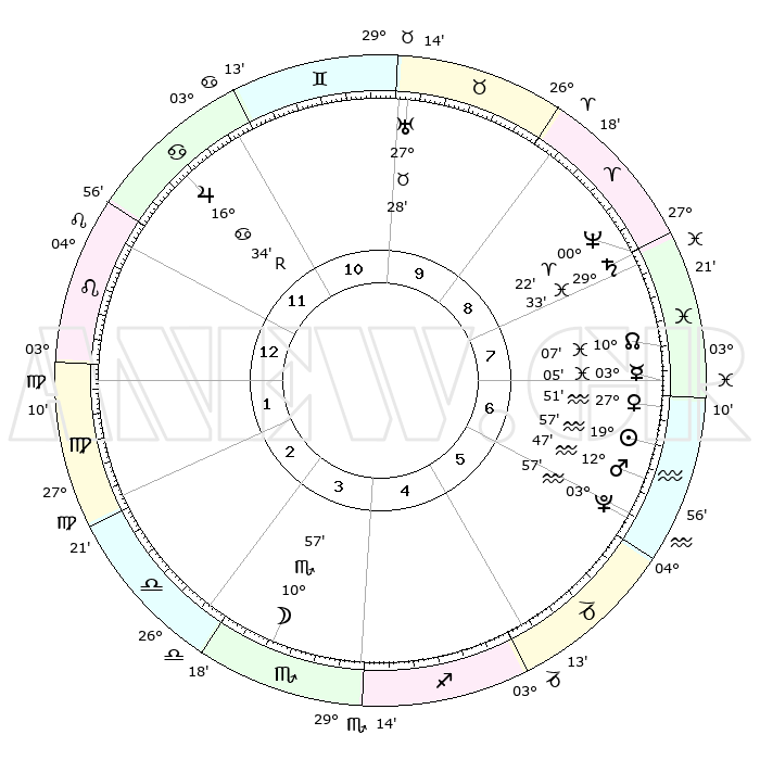 | | ΘΕΣΕΙΣ ΠΛΑΝΗΤΩΝ ΑΣΤΡΟΛΟΓΙΚΟΥ ΧΑΡΤΗ ΤΗΣ ΣΤΙΓΜΗΣ ΑΥΤΗΣ | | | | Πλανήτης | Ζώδιο | Μοίρες | Δεκαήμ. | Σε οίκο | Απόκλιση | | Ακμές των οίκων | | Ηλιος | Υδροχόος | 19°52' | Δεύτερο | 7 | 14 S 51 | | 1ος | 13°13' | Λέων | | Σελήνη | Σκορπιός | 10°07' | Δεύτερο | 4 | 19 S 12 | | 2ος | 05°21' | Παρθένος | | Ερμής | Ιχθείς | 02°57' | Πρώτο | 7 | 11 S 27 | | 3ος | 02°10' | Ζυγός | | Αφροδίτη | Υδροχόος | 27°46' | Τρίτο | 7 | 13 S 36 | | 4ος | 04°28' | Σκορπιός | | Αρης | Υδροχόος | 12°44' | Δεύτερο | 6 | 18 S 00 | | 5ος | 09°52' | Τοξότης | | Δίας | Καρκίνος | 16°34'R | Δεύτερο | 12 | 22 N 43 | | 6ος | 13°35' | Αιγόκερως | | Κρόνος | Ιχθείς | 29°32' | Τρίτο | 8 | 02 S 10 | | 7ος | 13°13' | Υδροχόος | | Ουρανός | Ταύρος | 27°28' | Τρίτο | 10 | 19 N 24 | | 8ος | 05°21' | Ιχθείς | | Ποσειδώνας | Κριός | 00°22' | Πρώτο | 8 | 01 S 03 | | 9ος | 02°10' | Κριός | | Πλούτωνας | Υδροχόος | 03°56' | Πρώτο | 6 | 22 S 59 | | 10ος | 04°28' | Ταύρος | | Β. Δεσμός | Ιχθείς | 10°07' | Δεύτερο | 8 | 07 S 46 | | 11ος | 09°52' | Δίδυμοι | | Ωροσκόπος | Λέων | 13°13' | Δεύτερο | | | 12ος | 13°35' | Καρκίνος | | Μεσουράνημα | Ταύρος | 04°28' | Πρώτο | | | |