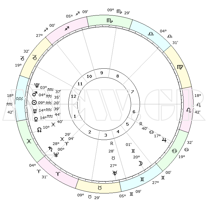 | | ΘΕΣΕΙΣ ΠΛΑΝΗΤΩΝ ΑΣΤΡΟΛΟΓΙΚΟΥ ΧΑΡΤΗ ΤΗΣ ΣΤΙΓΜΗΣ ΑΥΤΗΣ | | | | Πλανήτης | Ζώδιο | Μοίρες | Δεκαήμ. | Σε οίκο | Απόκλιση | | Ακμές των οίκων | | Ηλιος | Υδροχόος | 09°17' | Πρώτο | 1 | 17 S 56 | | 1ος | 21°35' | Αιγόκερως | | Σελήνη | Δίδυμοι | 19°08' | Δεύτερο | 5 | 28 N 06 | | 2ος | 04°04' | Ιχθείς | | Ερμής | Υδροχόος | 14°33' | Δεύτερο | 1 | 18 S 23 | | 3ος | 13°38' | Κριός | | Αφροδίτη | Υδροχόος | 14°40' | Δεύτερο | 1 | 17 S 41 | | 4ος | 13°37' | Ταύρος | | Αρης | Υδροχόος | 04°32' | Πρώτο | 1 | 20 S 07 | | 5ος | 07°06' | Δίδυμοι | | Δίας | Καρκίνος | 17°41'R | Δεύτερο | 6 | 22 N 34 | | 6ος | 28°20' | Δίδυμοι | | Κρόνος | Ιχθείς | 28°29' | Τρίτο | 2 | 02 S 36 | | 7ος | 21°35' | Καρκίνος | | Ουρανός | Ταύρος | 27°28'R | Τρίτο | 4 | 19 N 24 | | 8ος | 04°04' | Παρθένος | | Ποσειδώνας | Κριός | 00°04' | Πρώτο | 2 | 01 S 11 | | 9ος | 13°38' | Ζυγός | | Πλούτωνας | Υδροχόος | 03°37' | Πρώτο | 1 | 23 S 02 | | 10ος | 13°37' | Σκορπιός | | Β. Δεσμός | Ιχθείς | 10°41' | Δεύτερο | 2 | 07 S 34 | | 11ος | 07°06' | Τοξότης | | Ωροσκόπος | Αιγόκερως | 21°35' | Τρίτο | | | 12ος | 28°19' | Τοξότης | | Μεσουράνημα | Σκορπιός | 13°37' | Δεύτερο | | | |