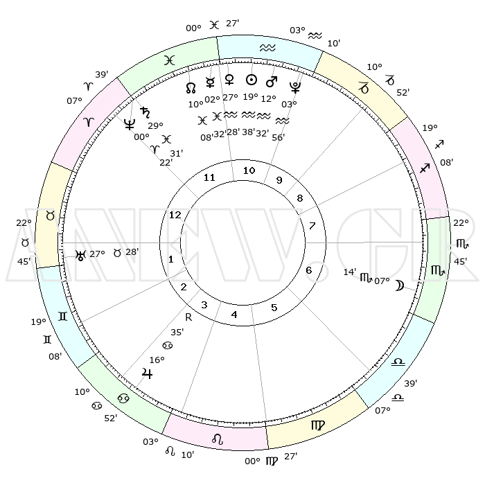 | | ΘΕΣΕΙΣ ΠΛΑΝΗΤΩΝ ΑΣΤΡΟΛΟΓΙΚΟΥ ΧΑΡΤΗ ΤΗΣ ΣΤΙΓΜΗΣ ΑΥΤΗΣ | | | | Πλανήτης | Ζώδιο | Μοίρες | Δεκαήμ. | Σε οίκο | Απόκλιση | | Ακμές των οίκων | | Ηλιος | Υδροχόος | 19°34' | Δεύτερο | 11 | 14 S 57 | | 1ος | 19°37' | Κριός | | Σελήνη | Σκορπιός | 06°27' | Πρώτο | 7 | 17 S 50 | | 2ος | 24°43' | Ταύρος | | Ερμής | Ιχθείς | 02°26' | Πρώτο | 11 | 11 S 41 | | 3ος | 19°26' | Δίδυμοι | | Αφροδίτη | Υδροχόος | 27°23' | Τρίτο | 11 | 13 S 44 | | 4ος | 11°11' | Καρκίνος | | Αρης | Υδροχόος | 12°29' | Δεύτερο | 11 | 18 S 04 | | 5ος | 04°40' | Λέων | | Δίας | Καρκίνος | 16°36'R | Δεύτερο | 4 | 22 N 43 | | 6ος | 05°23' | Παρθένος | | Κρόνος | Ιχθείς | 29°30' | Τρίτο | 12 | 02 S 11 | | 7ος | 19°37' | Ζυγός | | Ουρανός | Ταύρος | 27°28' | Τρίτο | 2 | 19 N 24 | | 8ος | 24°43' | Σκορπιός | | Ποσειδώνας | Κριός | 00°21' | Πρώτο | 12 | 01 S 04 | | 9ος | 19°26' | Τοξότης | | Πλούτωνας | Υδροχόος | 03°56' | Πρώτο | 10 | 22 S 59 | | 10ος | 11°11' | Αιγόκερως | | Β. Δεσμός | Ιχθείς | 10°08' | Δεύτερο | 12 | 07 S 46 | | 11ος | 04°40' | Υδροχόος | | Ωροσκόπος | Κριός | 19°37' | Δεύτερο | | | 12ος | 05°23' | Ιχθείς | | Μεσουράνημα | Αιγόκερως | 11°11' | Δεύτερο | | | |