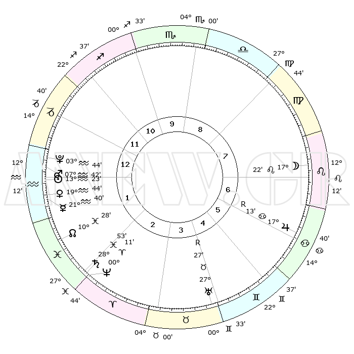 | | ΘΕΣΕΙΣ ΠΛΑΝΗΤΩΝ ΑΣΤΡΟΛΟΓΙΚΟΥ ΧΑΡΤΗ ΤΗΣ ΣΤΙΓΜΗΣ ΑΥΤΗΣ | | | | Πλανήτης | Ζώδιο | Μοίρες | Δεκαήμ. | Σε οίκο | Απόκλιση | | Ακμές των οίκων | | Ηλιος | Υδροχόος | 13°19' | Δεύτερο | 1 | 16 S 49 | | 1ος | 16°25' | Αιγόκερως | | Σελήνη | Λέων | 16°30' | Δεύτερο | 7 | 17 N 48 | | 2ος | 27°43' | Υδροχόος | | Ερμής | Υδροχόος | 21°33' | Τρίτο | 1 | 16 S 01 | | 3ος | 07°45' | Κριός | | Αφροδίτη | Υδροχόος | 19°39' | Δεύτερο | 1 | 16 S 14 | | 4ος | 08°43' | Ταύρος | | Αρης | Υδροχόος | 07°39' | Πρώτο | 1 | 19 S 22 | | 5ος | 02°45' | Δίδυμοι | | Δίας | Καρκίνος | 17°14'R | Δεύτερο | 7 | 22 N 38 | | 6ος | 23°58' | Δίδυμοι | | Κρόνος | Ιχθείς | 28°52' | Τρίτο | 2 | 02 S 26 | | 7ος | 16°25' | Καρκίνος | | Ουρανός | Ταύρος | 27°28'R | Τρίτο | 4 | 19 N 24 | | 8ος | 27°43' | Λέων | | Ποσειδώνας | Κριός | 00°11' | Πρώτο | 2 | 01 S 08 | | 9ος | 07°45' | Ζυγός | | Πλούτωνας | Υδροχόος | 03°44' | Πρώτο | 1 | 23 S 01 | | 10ος | 08°43' | Σκορπιός | | Β. Δεσμός | Ιχθείς | 10°28' | Δεύτερο | 2 | 07 S 38 | | 11ος | 02°45' | Τοξότης | | Ωροσκόπος | Αιγόκερως | 16°25' | Δεύτερο | | | 12ος | 23°58' | Τοξότης | | Μεσουράνημα | Σκορπιός | 08°43' | Πρώτο | | | |
