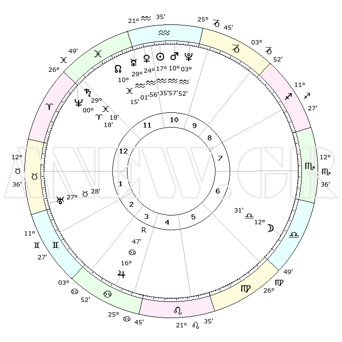 | | ΘΕΣΕΙΣ ΠΛΑΝΗΤΩΝ ΑΣΤΡΟΛΟΓΙΚΟΥ ΧΑΡΤΗ ΤΗΣ ΣΤΙΓΜΗΣ ΑΥΤΗΣ | | | | Πλανήτης | Ζώδιο | Μοίρες | Δεκαήμ. | Σε οίκο | Απόκλιση | | Ακμές των οίκων | | Ηλιος | Υδροχόος | 17°32' | Δεύτερο | 11 | 15 S 35 | | 1ος | 10°28' | Κριός | | Σελήνη | Ζυγός | 11°46' | Δεύτερο | 7 | 07 S 16 | | 2ος | 18°05' | Ταύρος | | Ερμής | Υδροχόος | 28°55' | Τρίτο | 12 | 13 S 11 | | 3ος | 13°58' | Δίδυμοι | | Αφροδίτη | Υδροχόος | 24°52' | Τρίτο | 11 | 14 S 34 | | 4ος | 05°54' | Καρκίνος | | Αρης | Υδροχόος | 10°55' | Δεύτερο | 11 | 18 S 31 | | 5ος | 28°45' | Καρκίνος | | Δίας | Καρκίνος | 16°48'R | Δεύτερο | 4 | 22 N 41 | | 6ος | 27°51' | Λέων | | Κρόνος | Ιχθείς | 29°18' | Τρίτο | 12 | 02 S 16 | | 7ος | 10°28' | Ζυγός | | Ουρανός | Ταύρος | 27°28' | Τρίτο | 2 | 19 N 24 | | 8ος | 18°05' | Σκορπιός | | Ποσειδώνας | Κριός | 00°18' | Πρώτο | 12 | 01 S 05 | | 9ος | 13°58' | Τοξότης | | Πλούτωνας | Υδροχόος | 03°52' | Πρώτο | 11 | 22 S 59 | | 10ος | 05°54' | Αιγόκερως | | Β. Δεσμός | Ιχθείς | 10°15' | Δεύτερο | 12 | 07 S 43 | | 11ος | 28°45' | Αιγόκερως | | Ωροσκόπος | Κριός | 10°28' | Δεύτερο | | | 12ος | 27°51' | Υδροχόος | | Μεσουράνημα | Αιγόκερως | 05°54' | Πρώτο | | | |