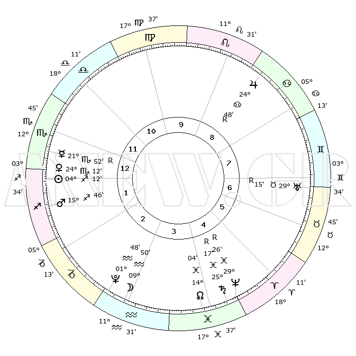 | | ΘΕΣΕΙΣ ΠΛΑΝΗΤΩΝ ΑΣΤΡΟΛΟΓΙΚΟΥ ΧΑΡΤΗ ΤΗΣ ΣΤΙΓΜΗΣ ΑΥΤΗΣ | | | | Πλανήτης | Ζώδιο | Μοίρες | Δεκαήμ. | Σε οίκο | Απόκλιση | | Ακμές των οίκων | | Ηλιος | Τοξότης | 04°11' | Πρώτο | 1 | 20 S 59 | | 1ος | 00°43' | Τοξότης | | Σελήνη | Υδροχόος | 09°43' | Πρώτο | 3 | 20 S 34 | | 2ος | 01°56' | Αιγόκερως | | Ερμής | Σκορπιός | 21°53'R | Τρίτο | 12 | 16 S 11 | | 3ος | 07°46' | Υδροχόος | | Αφροδίτη | Σκορπιός | 24°11' | Τρίτο | 12 | 17 S 58 | | 4ος | 13°49' | Ιχθείς | | Αρης | Τοξότης | 15°46' | Δεύτερο | 1 | 23 S 18 | | 5ος | 14°46' | Κριός | | Δίας | Καρκίνος | 24°48'R | Τρίτο | 8 | 21 N 18 | | 6ος | 09°43' | Ταύρος | | Κρόνος | Ιχθείς | 25°17'R | Τρίτο | 4 | 04 S 04 | | 7ος | 00°43' | Δίδυμοι | | Ουρανός | Ταύρος | 29°15'R | Τρίτο | 6 | 19 N 47 | | 8ος | 01°56' | Καρκίνος | | Ποσειδώνας | Ιχθείς | 29°26'R | Τρίτο | 4 | 01 S 28 | | 9ος | 07°46' | Λέων | | Πλούτωνας | Υδροχόος | 01°48' | Πρώτο | 2 | 23 S 25 | | 10ος | 13°49' | Παρθένος | | Β. Δεσμός | Ιχθείς | 14°04' | Δεύτερο | 4 | 06 S 16 | | 11ος | 14°46' | Ζυγός | | Ωροσκόπος | Τοξότης | 00°43' | Πρώτο | | | 12ος | 09°43' | Σκορπιός | | Μεσουράνημα | Παρθένος | 13°49' | Δεύτερο | | | |