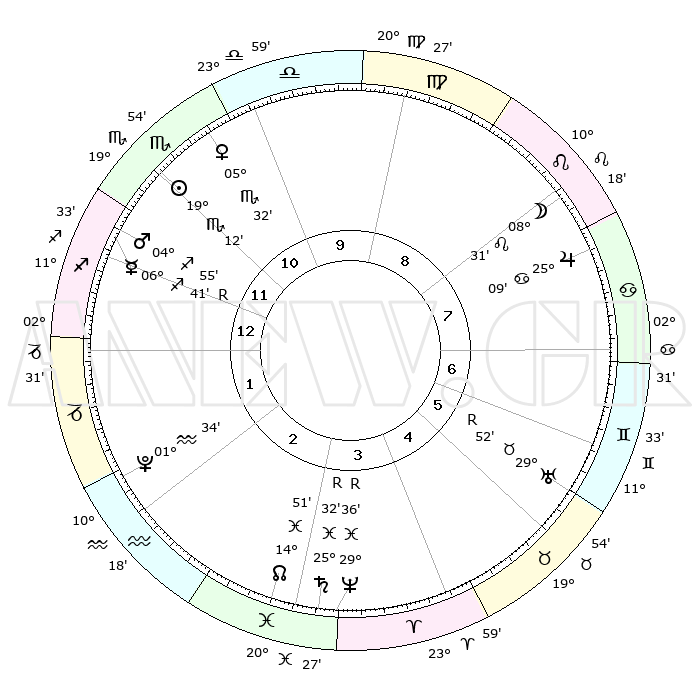 | | ΘΕΣΕΙΣ ΠΛΑΝΗΤΩΝ ΑΣΤΡΟΛΟΓΙΚΟΥ ΧΑΡΤΗ ΤΗΣ ΣΤΙΓΜΗΣ ΑΥΤΗΣ | | | | Πλανήτης | Ζώδιο | Μοίρες | Δεκαήμ. | Σε οίκο | Απόκλιση | | Ακμές των οίκων | | Ηλιος | Σκορπιός | 19°07' | Δεύτερο | 12 | 17 S 30 | | 1ος | 07°16' | Τοξότης | | Σελήνη | Λέων | 07°25' | Πρώτο | 8 | 21 N 29 | | 2ος | 09°31' | Αιγόκερως | | Ερμής | Τοξότης | 06°42'R | Πρώτο | 12 | 23 S 30 | | 3ος | 16°27' | Υδροχόος | | Αφροδίτη | Σκορπιός | 05°26' | Πρώτο | 11 | 12 S 06 | | 4ος | 22°31' | Ιχθείς | | Αρης | Τοξότης | 04°51' | Πρώτο | 12 | 21 S 35 | | 5ος | 22°33' | Κριός | | Δίας | Καρκίνος | 25°09' | Τρίτο | 8 | 21 N 12 | | 6ος | 16°38' | Ταύρος | | Κρόνος | Ιχθείς | 25°32'R | Τρίτο | 4 | 04 S 01 | | 7ος | 07°16' | Δίδυμοι | | Ουρανός | Ταύρος | 29°52'R | Τρίτο | 6 | 19 N 55 | | 8ος | 09°31' | Καρκίνος | | Ποσειδώνας | Ιχθείς | 29°36'R | Τρίτο | 4 | 01 S 24 | | 9ος | 16°27' | Λέων | | Πλούτωνας | Υδροχόος | 01°33' | Πρώτο | 2 | 23 S 29 | | 10ος | 22°31' | Παρθένος | | Β. Δεσμός | Ιχθείς | 14°51' | Δεύτερο | 3 | 05 S 58 | | 11ος | 22°33' | Ζυγός | | Ωροσκόπος | Τοξότης | 07°16' | Πρώτο | | | 12ος | 16°38' | Σκορπιός | | Μεσουράνημα | Παρθένος | 22°31' | Τρίτο | | | |