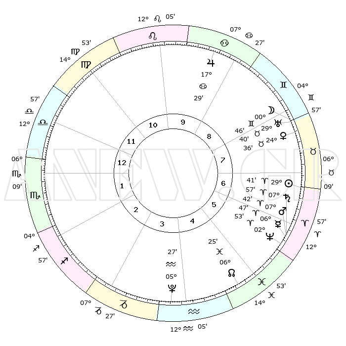 | | ΘΕΣΕΙΣ ΠΛΑΝΗΤΩΝ ΑΣΤΡΟΛΟΓΙΚΟΥ ΧΑΡΤΗ ΤΗΣ ΣΤΙΓΜΗΣ ΑΥΤΗΣ | | | | Πλανήτης | Ζώδιο | Μοίρες | Δεκαήμ. | Σε οίκο | Απόκλιση | | Ακμές των οίκων | | Ηλιος | Κριός | 29°37' | Τρίτο | 7 | 11 N 20 | | 1ος | 18°45' | Ζυγός | | Σελήνη | Ταύρος | 29°52' | Τρίτο | 8 | 25 N 03 | | 2ος | 16°31' | Σκορπιός | | Ερμής | Κριός | 06°41' | Πρώτο | 6 | 00 N 15 | | 3ος | 17°44' | Τοξότης | | Αφροδίτη | Ταύρος | 24°32' | Τρίτο | 8 | 19 N 16 | | 4ος | 21°16' | Αιγόκερως | | Αρης | Κριός | 07°40' | Πρώτο | 6 | 02 N 09 | | 5ος | 24°13' | Υδροχόος | | Δίας | Καρκίνος | 17°28' | Δεύτερο | 9 | 22 N 40 | | 6ος | 23°45' | Ιχθείς | | Κρόνος | Κριός | 07°57' | Πρώτο | 6 | 01 N 10 | | 7ος | 18°45' | Κριός | | Ουρανός | Ταύρος | 29°40' | Τρίτο | 8 | 19 N 55 | | 8ος | 16°31' | Ταύρος | | Ποσειδώνας | Κριός | 02°53' | Πρώτο | 6 | 00 S 03 | | 9ος | 17°44' | Δίδυμοι | | Πλούτωνας | Υδροχόος | 05°27' | Πρώτο | 4 | 22 S 48 | | 10ος | 21°16' | Καρκίνος | | Β. Δεσμός | Ιχθείς | 06°25' | Πρώτο | 5 | 09 S 09 | | 11ος | 24°13' | Λέων | | Ωροσκόπος | Ζυγός | 18°45' | Δεύτερο | | | 12ος | 23°45' | Παρθένος | | Μεσουράνημα | Καρκίνος | 21°16' | Τρίτο | | | |
