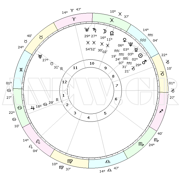 | | ΘΕΣΕΙΣ ΠΛΑΝΗΤΩΝ ΑΣΤΡΟΛΟΓΙΚΟΥ ΧΑΡΤΗ ΤΗΣ ΣΤΙΓΜΗΣ ΑΥΤΗΣ | | | | Πλανήτης | Ζώδιο | Μοίρες | Δεκαήμ. | Σε οίκο | Απόκλιση | | Ακμές των οίκων | | Ηλιος | Υδροχόος | 02°27' | Πρώτο | 9 | 19 S 37 | | 1ος | 05°02' | Δίδυμοι | | Σελήνη | Ιχθείς | 15°33' | Δεύτερο | 11 | 05 S 11 | | 2ος | 28°53' | Δίδυμοι | | Ερμής | Υδροχόος | 02°60' | Πρώτο | 9 | 21 S 30 | | 3ος | 20°09' | Καρκίνος | | Αφροδίτη | Υδροχόος | 06°14' | Πρώτο | 9 | 19 S 51 | | 4ος | 13°19' | Λέων | | Αρης | Αιγόκερως | 29°18' | Τρίτο | 9 | 21 S 17 | | 5ος | 12°41' | Παρθένος | | Δίας | Καρκίνος | 18°30'R | Δεύτερο | 2 | 22 N 26 | | 6ος | 21°51' | Ζυγός | | Κρόνος | Ιχθείς | 27°52' | Τρίτο | 11 | 02 S 52 | | 7ος | 05°02' | Τοξότης | | Ουρανός | Ταύρος | 27°31'R | Τρίτο | 12 | 19 N 25 | | 8ος | 28°53' | Τοξότης | | Ποσειδώνας | Ιχθείς | 29°54' | Τρίτο | 11 | 01 S 15 | | 9ος | 20°09' | Αιγόκερως | | Πλούτωνας | Υδροχόος | 03°24' | Πρώτο | 9 | 23 S 05 | | 10ος | 13°19' | Υδροχόος | | Β. Δεσμός | Ιχθείς | 11°02' | Δεύτερο | 10 | 07 S 26 | | 11ος | 12°41' | Ιχθείς | | Ωροσκόπος | Δίδυμοι | 05°02' | Πρώτο | | | 12ος | 21°51' | Κριός | | Μεσουράνημα | Υδροχόος | 13°19' | Δεύτερο | | | |
