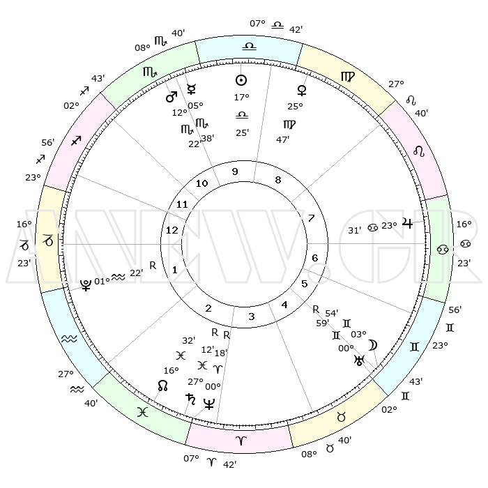 | ΘΕΣΕΙΣ ΠΛΑΝΗΤΩΝ ΑΣΤΡΟΛΟΓΙΚΟΥ ΧΑΡΤΗ ΤΗΣ ΣΤΙΓΜΗΣ ΑΥΤΗΣ | | Πλανήτης | Ζώδιο | Μοίρες | Δεκαήμ. | Σε οίκο | Απόκλιση | | Ακμές των οίκων | Ηλιος | Ζυγός | 17°10' | Δεύτερο | 12 | 06 S 45 | | 1ος | 28°54' | Ζυγός | Σελήνη | Δίδυμοι | 00°10' | Πρώτο | 8 | 25 N 01 | | 2ος | 27°15' | Σκορπιός | Ερμής | Σκορπιός | 05°15' | Πρώτο | 1 | 14 S 24 | | 3ος | 29°07' | Τοξότης | Αφροδίτη | Παρθένος | 25°29' | Τρίτο | 11 | 03 N 08 | | 4ος | 03°14' | Υδροχόος | Αρης | Σκορπιός | 12°12' | Δεύτερο | 1 | 15 S 40 | | 5ος | 06°10' | Ιχθείς | Δίας | Καρκίνος | 23°29' | Τρίτο | 9 | 21 N 26 | | 6ος | 04°56' | Κριός | Κρόνος | Ιχθείς | 27°13'R | Τρίτο | 5 | 03 S 25 | | 7ος | 28°54' | Κριός | Ουρανός | Δίδυμοι | 00°59'R | Πρώτο | 8 | 20 N 09 | | 8ος | 27°15' | Ταύρος | Ποσειδώνας | Κριός | 00°18'R | Πρώτο | 5 | 01 S 09 | | 9ος | 29°07' | Δίδυμοι | Πλούτωνας | Υδροχόος | 01°22'R | Πρώτο | 3 | 23 S 32 | | 10ος | 03°14' | Λέων | Β. Δεσμός | Ιχθείς | 16°33' | Δεύτερο | 5 | 05 S 18 | | 11ος | 06°10' | Παρθένος | Ωροσκόπος | Ζυγός | 28°54' | Τρίτο | | | 12ος | 04°56' | Ζυγός | Μεσουράνημα | Λέων | 03°14' | Πρώτο | | | |