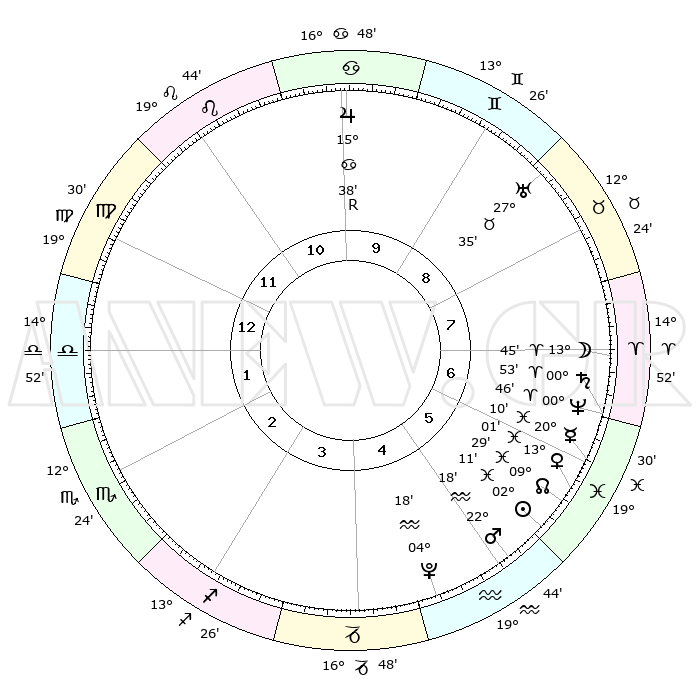 | | ΘΕΣΕΙΣ ΠΛΑΝΗΤΩΝ ΑΣΤΡΟΛΟΓΙΚΟΥ ΧΑΡΤΗ ΤΗΣ ΣΤΙΓΜΗΣ ΑΥΤΗΣ | | | | Πλανήτης | Ζώδιο | Μοίρες | Δεκαήμ. | Σε οίκο | Απόκλιση | | Ακμές των οίκων | | Ηλιος | Ιχθείς | 02°06' | Πρώτο | 6 | 10 S 43 | | 1ος | 22°21' | Παρθένος | | Σελήνη | Κριός | 12°42' | Δεύτερο | 7 | 07 N 43 | | 2ος | 18°21' | Ζυγός | | Ερμής | Ιχθείς | 20°06' | Τρίτο | 6 | 02 S 36 | | 3ος | 18°28' | Σκορπιός | | Αφροδίτη | Ιχθείς | 12°55' | Δεύτερο | 6 | 08 S 03 | | 4ος | 21°24' | Τοξότης | | Αρης | Υδροχόος | 22°15' | Τρίτο | 5 | 15 S 07 | | 5ος | 24°31' | Αιγόκερως | | Δίας | Καρκίνος | 15°38'R | Δεύτερο | 10 | 22 N 51 | | 6ος | 25°14' | Υδροχόος | | Κρόνος | Κριός | 00°52' | Πρώτο | 7 | 01 S 37 | | 7ος | 22°21' | Ιχθείς | | Ουρανός | Ταύρος | 27°35' | Τρίτο | 9 | 19 N 26 | | 8ος | 18°21' | Κριός | | Ποσειδώνας | Κριός | 00°46' | Πρώτο | 7 | 00 S 54 | | 9ος | 18°28' | Ταύρος | | Πλούτωνας | Υδροχόος | 04°18' | Πρώτο | 5 | 22 S 55 | | 10ος | 21°24' | Δίδυμοι | | Β. Δεσμός | Ιχθείς | 09°29' | Πρώτο | 6 | 08 S 01 | | 11ος | 24°31' | Καρκίνος | | Ωροσκόπος | Παρθένος | 22°21' | Τρίτο | | | 12ος | 25°14' | Λέων | | Μεσουράνημα | Δίδυμοι | 21°24' | Τρίτο | | | |
