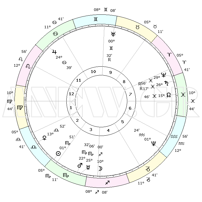 | | ΘΕΣΕΙΣ ΠΛΑΝΗΤΩΝ ΑΣΤΡΟΛΟΓΙΚΟΥ ΧΑΡΤΗ ΤΗΣ ΣΤΙΓΜΗΣ ΑΥΤΗΣ | | | | Πλανήτης | Ζώδιο | Μοίρες | Δεκαήμ. | Σε οίκο | Απόκλιση | | Ακμές των οίκων | | Ηλιος | Σκορπιός | 01°21' | Πρώτο | 8 | 11 S 57 | | 1ος | 21°01' | Υδροχόος | | Σελήνη | Τοξότης | 04°03' | Πρώτο | 9 | 25 S 51 | | 2ος | 06°50' | Κριός | | Ερμής | Σκορπιός | 24°30' | Τρίτο | 9 | 21 S 24 | | 3ος | 11°20' | Ταύρος | | Αφροδίτη | Ζυγός | 13°14' | Δεύτερο | 8 | 03 S 49 | | 4ος | 06°43' | Δίδυμοι | | Αρης | Σκορπιός | 22°11' | Τρίτο | 9 | 18 S 37 | | 5ος | 28°31' | Δίδυμοι | | Δίας | Καρκίνος | 24°37' | Τρίτο | 6 | 21 N 16 | | 6ος | 21°14' | Καρκίνος | | Κρόνος | Ιχθείς | 26°18'R | Τρίτο | 1 | 03 S 45 | | 7ος | 21°01' | Λέων | | Ουρανός | Δίδυμοι | 00°33'R | Πρώτο | 3 | 20 N 03 | | 8ος | 06°50' | Ζυγός | | Ποσειδώνας | Ιχθείς | 29°57'R | Τρίτο | 1 | 01 S 17 | | 9ος | 11°20' | Σκορπιός | | Πλούτωνας | Υδροχόος | 01°24' | Πρώτο | 12 | 23 S 32 | | 10ος | 06°43' | Τοξότης | | Β. Δεσμός | Ιχθείς | 15°48' | Δεύτερο | 1 | 05 S 36 | | 11ος | 28°31' | Τοξότης | | Ωροσκόπος | Υδροχόος | 21°01' | Τρίτο | | | 12ος | 21°14' | Αιγόκερως | | Μεσουράνημα | Τοξότης | 06°43' | Πρώτο | | | |