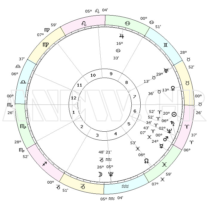 | | ΘΕΣΕΙΣ ΠΛΑΝΗΤΩΝ ΑΣΤΡΟΛΟΓΙΚΟΥ ΧΑΡΤΗ ΤΗΣ ΣΤΙΓΜΗΣ ΑΥΤΗΣ | | | | Πλανήτης | Ζώδιο | Μοίρες | Δεκαήμ. | Σε οίκο | Απόκλιση | | Ακμές των οίκων | | Ηλιος | Κριός | 20°47' | Τρίτο | 7 | 08 N 07 | | 1ος | 06°37' | Ζυγός | | Σελήνη | Αιγόκερως | 25°49' | Τρίτο | 4 | 24 S 24 | | 2ος | 03°39' | Σκορπιός | | Ερμής | Ιχθείς | 24°01' | Τρίτο | 6 | 04 S 34 | | 3ος | 04°21' | Τοξότης | | Αφροδίτη | Ταύρος | 13°30' | Δεύτερο | 8 | 15 N 52 | | 4ος | 07°26' | Αιγόκερως | | Αρης | Κριός | 00°40' | Πρώτο | 6 | 00 S 40 | | 5ος | 10°22' | Υδροχόος | | Δίας | Καρκίνος | 16°33' | Δεύτερο | 10 | 22 N 47 | | 6ος | 10°32' | Ιχθείς | | Κρόνος | Κριός | 06°51' | Πρώτο | 7 | 00 N 45 | | 7ος | 06°37' | Κριός | | Ουρανός | Ταύρος | 29°13' | Τρίτο | 8 | 19 N 49 | | 8ος | 03°39' | Ταύρος | | Ποσειδώνας | Κριός | 02°34' | Πρώτο | 6 | 00 S 11 | | 9ος | 04°21' | Δίδυμοι | | Πλούτωνας | Υδροχόος | 05°21' | Πρώτο | 4 | 22 S 47 | | 10ος | 07°26' | Καρκίνος | | Β. Δεσμός | Ιχθείς | 06°54' | Πρώτο | 5 | 08 S 59 | | 11ος | 10°22' | Λέων | | Ωροσκόπος | Ζυγός | 06°37' | Πρώτο | | | 12ος | 10°32' | Παρθένος | | Μεσουράνημα | Καρκίνος | 07°26' | Πρώτο | | | |