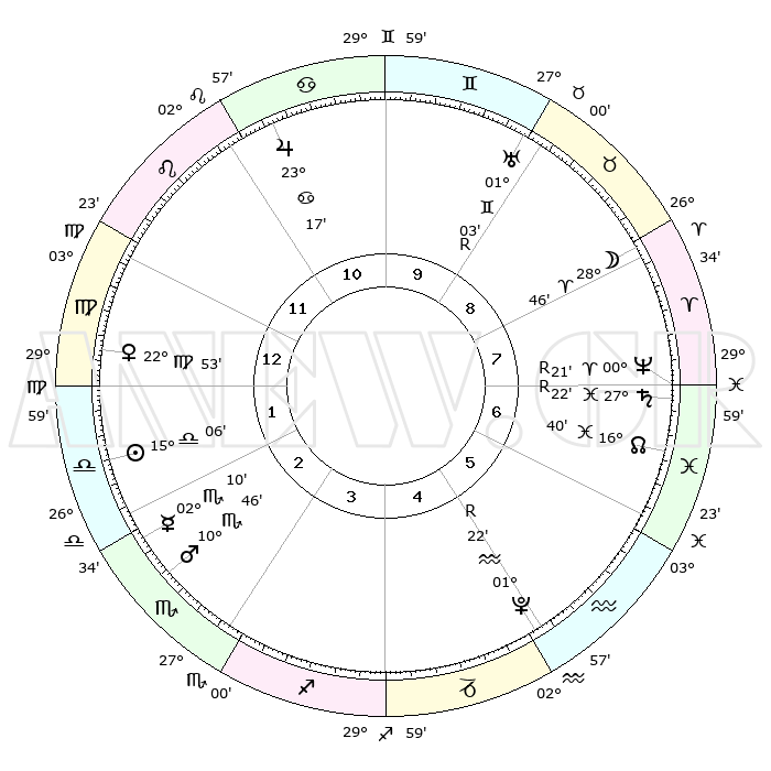 | ΘΕΣΕΙΣ ΠΛΑΝΗΤΩΝ ΑΣΤΡΟΛΟΓΙΚΟΥ ΧΑΡΤΗ ΤΗΣ ΣΤΙΓΜΗΣ ΑΥΤΗΣ | | Πλανήτης | Ζώδιο | Μοίρες | Δεκαήμ. | Σε οίκο | Απόκλιση | | Ακμές των οίκων | Ηλιος | Ζυγός | 15°00' | Δεύτερο | 2 | 05 S 55 | | 1ος | 29°25' | Λέων | Σελήνη | Κριός | 27°12' | Τρίτο | 9 | 13 N 32 | | 2ος | 23°12' | Παρθένος | Ερμής | Σκορπιός | 02°01' | Πρώτο | 3 | 13 S 03 | | 3ος | 21°49' | Ζυγός | Αφροδίτη | Παρθένος | 22°46' | Τρίτο | 1 | 04 N 11 | | 4ος | 24°44' | Σκορπιός | Αρης | Σκορπιός | 10°41' | Δεύτερο | 3 | 15 S 10 | | 5ος | 28°58' | Τοξότης | Δίας | Καρκίνος | 23°16' | Τρίτο | 11 | 21 N 28 | | 6ος | 00°58' | Υδροχόος | Κρόνος | Ιχθείς | 27°22'R | Τρίτο | 8 | 03 S 21 | | 7ος | 29°25' | Υδροχόος | Ουρανός | Δίδυμοι | 01°03'R | Πρώτο | 10 | 20 N 09 | | 8ος | 23°12' | Ιχθείς | Ποσειδώνας | Κριός | 00°21'R | Πρώτο | 8 | 01 S 07 | | 9ος | 21°49' | Κριός | Πλούτωνας | Υδροχόος | 01°22'R | Πρώτο | 6 | 23 S 32 | | 10ος | 24°44' | Ταύρος | Β. Δεσμός | Ιχθείς | 16°40' | Δεύτερο | 7 | 05 S 16 | | 11ος | 28°58' | Δίδυμοι | Ωροσκόπος | Λέων | 29°25' | Τρίτο | | | 12ος | 00°58' | Λέων | Μεσουράνημα | Ταύρος | 24°44' | Τρίτο | | | |