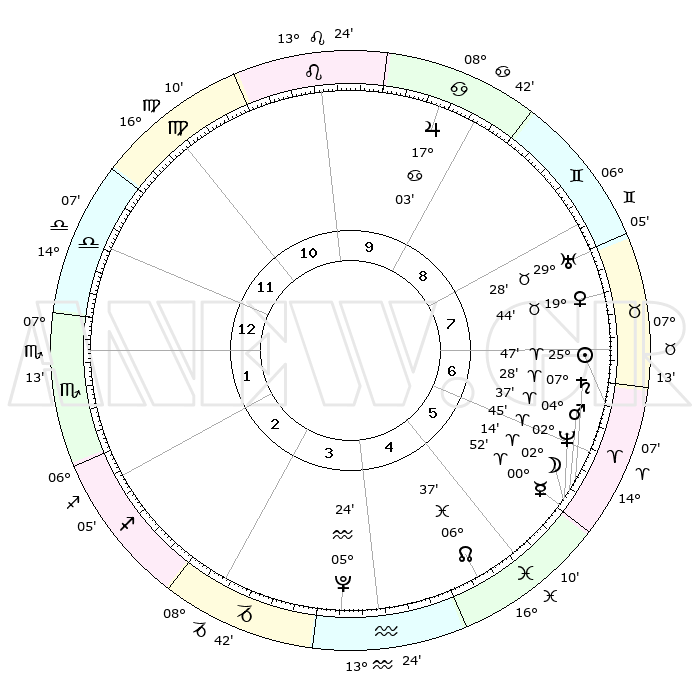 | | ΘΕΣΕΙΣ ΠΛΑΝΗΤΩΝ ΑΣΤΡΟΛΟΓΙΚΟΥ ΧΑΡΤΗ ΤΗΣ ΣΤΙΓΜΗΣ ΑΥΤΗΣ | | | | Πλανήτης | Ζώδιο | Μοίρες | Δεκαήμ. | Σε οίκο | Απόκλιση | | Ακμές των οίκων | | Ηλιος | Κριός | 25°43' | Τρίτο | 7 | 09 N 56 | | 1ος | 16°58' | Ζυγός | | Σελήνη | Κριός | 01°15' | Πρώτο | 6 | 02 N 21 | | 2ος | 14°38' | Σκορπιός | | Ερμής | Κριός | 00°46' | Πρώτο | 6 | 02 S 05 | | 3ος | 15°46' | Τοξότης | | Αφροδίτη | Ταύρος | 19°39' | Δεύτερο | 8 | 17 N 50 | | 4ος | 19°13' | Αιγόκερως | | Αρης | Κριός | 04°34' | Πρώτο | 6 | 00 N 55 | | 5ος | 22°09' | Υδροχόος | | Δίας | Καρκίνος | 17°02' | Δεύτερο | 9 | 22 N 44 | | 6ος | 21°48' | Ιχθείς | | Κρόνος | Κριός | 07°28' | Πρώτο | 6 | 00 N 59 | | 7ος | 16°58' | Κριός | | Ουρανός | Ταύρος | 29°27' | Τρίτο | 8 | 19 N 52 | | 8ος | 14°38' | Ταύρος | | Ποσειδώνας | Κριός | 02°45' | Πρώτο | 6 | 00 S 07 | | 9ος | 15°46' | Δίδυμοι | | Πλούτωνας | Υδροχόος | 05°24' | Πρώτο | 4 | 22 S 47 | | 10ος | 19°13' | Καρκίνος | | Β. Δεσμός | Ιχθείς | 06°38' | Πρώτο | 5 | 09 S 05 | | 11ος | 22°09' | Λέων | | Ωροσκόπος | Ζυγός | 16°58' | Δεύτερο | | | 12ος | 21°48' | Παρθένος | | Μεσουράνημα | Καρκίνος | 19°13' | Δεύτερο | | | |