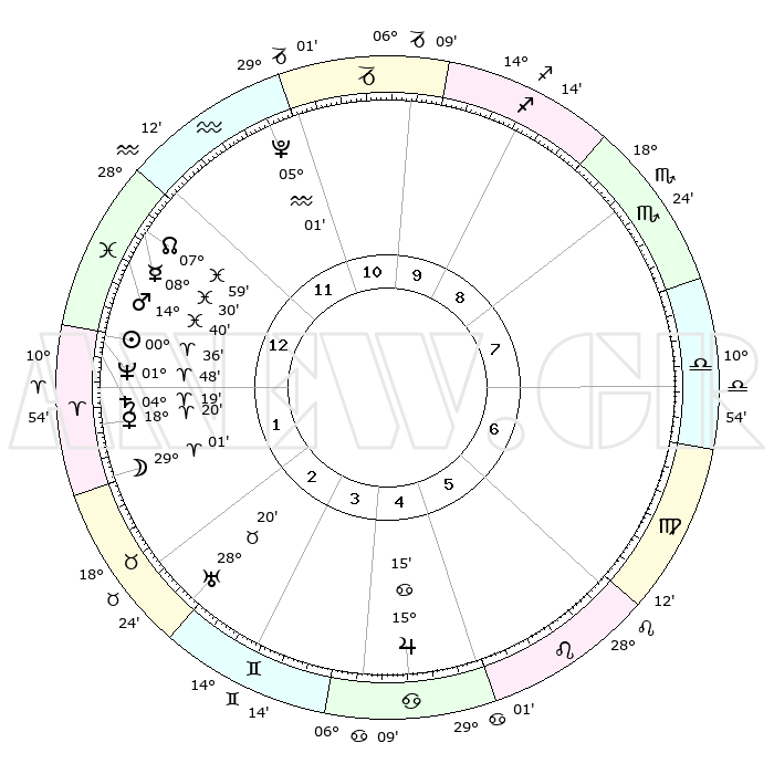 | | ΘΕΣΕΙΣ ΠΛΑΝΗΤΩΝ ΑΣΤΡΟΛΟΓΙΚΟΥ ΧΑΡΤΗ ΤΗΣ ΣΤΙΓΜΗΣ ΑΥΤΗΣ | | | | Πλανήτης | Ζώδιο | Μοίρες | Δεκαήμ. | Σε οίκο | Απόκλιση | | Ακμές των οίκων | | Ηλιος | Κριός | 00°27' | Πρώτο | 2 | 00 N 11 | | 1ος | 22°16' | Αιγόκερως | | Σελήνη | Κριός | 26°50' | Τρίτο | 3 | 13 N 58 | | 2ος | 04°54' | Ιχθείς | | Ερμής | Ιχθείς | 08°30' | Πρώτο | 2 | 07 S 31 | | 3ος | 14°24' | Κριός | | Αφροδίτη | Κριός | 18°08' | Δεύτερο | 3 | 06 N 19 | | 4ος | 14°15' | Ταύρος | | Αρης | Ιχθείς | 14°33' | Δεύτερο | 2 | 07 S 05 | | 5ος | 07°40' | Δίδυμοι | | Δίας | Καρκίνος | 15°15' | Δεύτερο | 6 | 22 N 55 | | 6ος | 28°54' | Δίδυμοι | | Κρόνος | Κριός | 04°18' | Πρώτο | 2 | 00 S 15 | | 7ος | 22°16' | Καρκίνος | | Ουρανός | Ταύρος | 28°19' | Τρίτο | 4 | 19 N 37 | | 8ος | 04°54' | Παρθένος | | Ποσειδώνας | Κριός | 01°48' | Πρώτο | 2 | 00 S 29 | | 9ος | 14°24' | Ζυγός | | Πλούτωνας | Υδροχόος | 05°01' | Πρώτο | 1 | 22 S 48 | | 10ος | 14°15' | Σκορπιός | | Β. Δεσμός | Ιχθείς | 07°59' | Πρώτο | 2 | 08 S 34 | | 11ος | 07°40' | Τοξότης | | Ωροσκόπος | Αιγόκερως | 22°16' | Τρίτο | | | 12ος | 28°54' | Τοξότης | | Μεσουράνημα | Σκορπιός | 14°15' | Δεύτερο | | | |