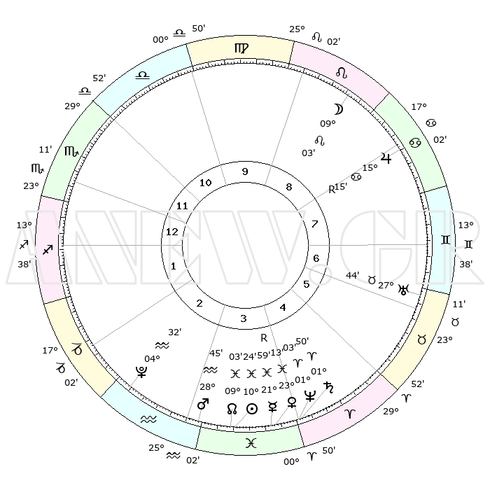 | | ΘΕΣΕΙΣ ΠΛΑΝΗΤΩΝ ΑΣΤΡΟΛΟΓΙΚΟΥ ΧΑΡΤΗ ΤΗΣ ΣΤΙΓΜΗΣ ΑΥΤΗΣ | | | | Πλανήτης | Ζώδιο | Μοίρες | Δεκαήμ. | Σε οίκο | Απόκλιση | | Ακμές των οίκων | | Ηλιος | Ιχθείς | 10°20' | Δεύτερο | 4 | 07 S 41 | | 1ος | 24°08' | Σκορπιός | | Σελήνη | Λέων | 08°08' | Πρώτο | 9 | 20 N 51 | | 2ος | 24°32' | Τοξότης | | Ερμής | Ιχθείς | 22°00'R | Τρίτο | 4 | 00 S 09 | | 3ος | 29°18' | Αιγόκερως | | Αφροδίτη | Ιχθείς | 23°08' | Τρίτο | 4 | 03 S 58 | | 4ος | 05°08' | Ιχθείς | | Αρης | Υδροχόος | 28°42' | Τρίτο | 3 | 12 S 57 | | 5ος | 06°49' | Κριός | | Δίας | Καρκίνος | 15°15'R | Δεύτερο | 8 | 22 N 54 | | 6ος | 02°40' | Ταύρος | | Κρόνος | Κριός | 01°50' | Πρώτο | 4 | 01 S 14 | | 7ος | 24°08' | Ταύρος | | Ουρανός | Ταύρος | 27°44' | Τρίτο | 7 | 19 N 28 | | 8ος | 24°32' | Δίδυμοι | | Ποσειδώνας | Κριός | 01°03' | Πρώτο | 4 | 00 S 47 | | 9ος | 29°18' | Καρκίνος | | Πλούτωνας | Υδροχόος | 04°32' | Πρώτο | 3 | 22 S 53 | | 10ος | 05°08' | Παρθένος | | Β. Δεσμός | Ιχθείς | 09°03' | Πρώτο | 4 | 08 S 11 | | 11ος | 06°49' | Ζυγός | | Ωροσκόπος | Σκορπιός | 24°08' | Τρίτο | | | 12ος | 02°40' | Σκορπιός | | Μεσουράνημα | Παρθένος | 05°08' | Πρώτο | | | |