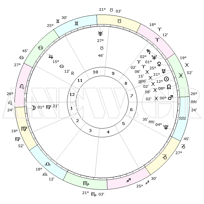 | | ΘΕΣΕΙΣ ΠΛΑΝΗΤΩΝ ΑΣΤΡΟΛΟΓΙΚΟΥ ΧΑΡΤΗ ΤΗΣ ΣΤΙΓΜΗΣ ΑΥΤΗΣ | | | | Πλανήτης | Ζώδιο | Μοίρες | Δεκαήμ. | Σε οίκο | Απόκλιση | | Ακμές των οίκων | | Ηλιος | Ιχθείς | 11°59' | Δεύτερο | 8 | 07 S 04 | | 1ος | 08°05' | Λέων | | Σελήνη | Παρθένος | 00°30' | Πρώτο | 2 | 12 N 01 | | 2ος | 29°45' | Λέων | | Ερμής | Ιχθείς | 21°08'R | Τρίτο | 8 | 00 S 17 | | 3ος | 25°54' | Παρθένος | | Αφροδίτη | Ιχθείς | 25°10' | Τρίτο | 8 | 03 S 09 | | 4ος | 27°48' | Ζυγός | | Αρης | Υδροχόος | 29°59' | Τρίτο | 8 | 12 S 30 | | 5ος | 03°31' | Τοξότης | | Δίας | Καρκίνος | 15°12'R | Δεύτερο | 12 | 22 N 55 | | 6ος | 07°57' | Αιγόκερως | | Κρόνος | Κριός | 02°01' | Πρώτο | 9 | 01 S 09 | | 7ος | 08°05' | Υδροχόος | | Ουρανός | Ταύρος | 27°46' | Τρίτο | 10 | 19 N 29 | | 8ος | 29°45' | Υδροχόος | | Ποσειδώνας | Κριός | 01°06' | Πρώτο | 9 | 00 S 46 | | 9ος | 25°54' | Ιχθείς | | Πλούτωνας | Υδροχόος | 04°35' | Πρώτο | 6 | 22 S 52 | | 10ος | 27°48' | Κριός | | Β. Δεσμός | Ιχθείς | 08°58' | Πρώτο | 8 | 08 S 12 | | 11ος | 03°31' | Δίδυμοι | | Ωροσκόπος | Λέων | 08°05' | Πρώτο | | | 12ος | 07°57' | Καρκίνος | | Μεσουράνημα | Κριός | 27°48' | Τρίτο | | | |