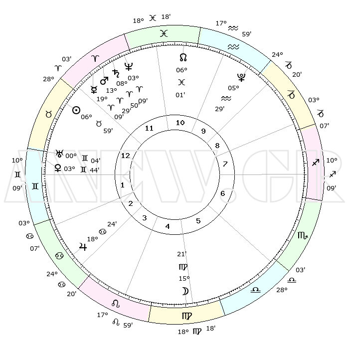 | | ΘΕΣΕΙΣ ΠΛΑΝΗΤΩΝ ΑΣΤΡΟΛΟΓΙΚΟΥ ΧΑΡΤΗ ΤΗΣ ΣΤΙΓΜΗΣ ΑΥΤΗΣ | | | | Πλανήτης | Ζώδιο | Μοίρες | Δεκαήμ. | Σε οίκο | Απόκλιση | | Ακμές των οίκων | | Ηλιος | Ταύρος | 06°56' | Πρώτο | 12 | 13 N 49 | | 1ος | 16°10' | Ταύρος | | Σελήνη | Παρθένος | 14°38' | Δεύτερο | 5 | 05 N 27 | | 2ος | 14°06' | Δίδυμοι | | Ερμής | Κριός | 19°03' | Δεύτερο | 12 | 05 N 21 | | 3ος | 06°16' | Καρκίνος | | Αφροδίτη | Δίδυμοι | 03°39' | Πρώτο | 1 | 21 N 36 | | 4ος | 28°16' | Καρκίνος | | Αρης | Κριός | 13°27' | Δεύτερο | 12 | 04 N 28 | | 5ος | 24°35' | Λέων | | Δίας | Καρκίνος | 18°24' | Δεύτερο | 3 | 22 N 33 | | 6ος | 00°32' | Ζυγός | | Κρόνος | Κριός | 08°50' | Πρώτο | 12 | 01 N 30 | | 7ος | 16°10' | Σκορπιός | | Ουρανός | Δίδυμοι | 00°04' | Πρώτο | 1 | 20 N 00 | | 8ος | 14°06' | Τοξότης | | Ποσειδώνας | Κριός | 03°08' | Πρώτο | 12 | 00 N 02 | | 9ος | 06°16' | Αιγόκερως | | Πλούτωνας | Υδροχόος | 05°29' | Πρώτο | 10 | 22 S 48 | | 10ος | 28°16' | Αιγόκερως | | Β. Δεσμός | Ιχθείς | 06°01' | Πρώτο | 11 | 09 S 18 | | 11ος | 24°35' | Υδροχόος | | Ωροσκόπος | Ταύρος | 16°10' | Δεύτερο | | | 12ος | 00°32' | Κριός | | Μεσουράνημα | Αιγόκερως | 28°16' | Τρίτο | | | |