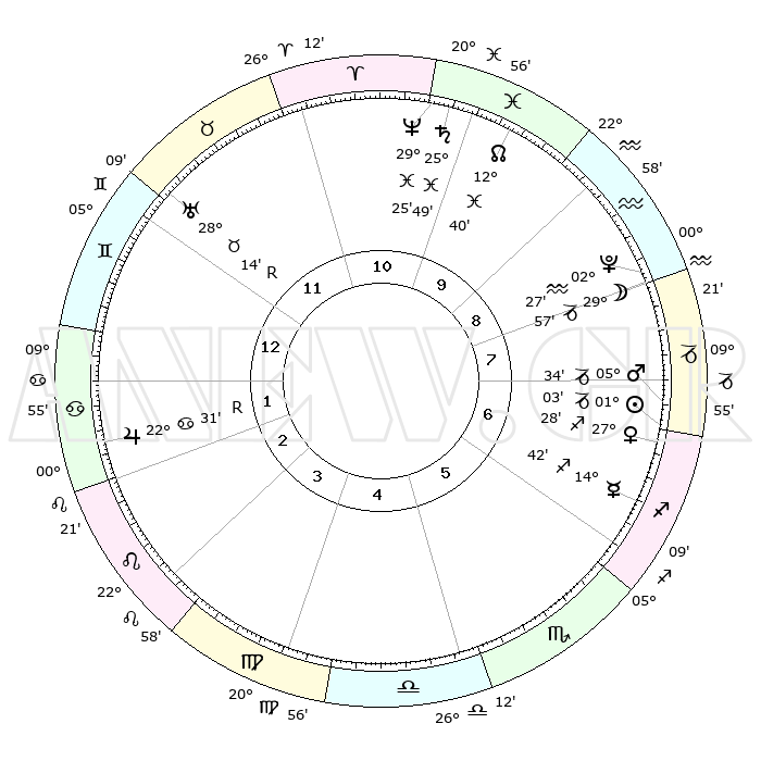 | | ΘΕΣΕΙΣ ΠΛΑΝΗΤΩΝ ΑΣΤΡΟΛΟΓΙΚΟΥ ΧΑΡΤΗ ΤΗΣ ΣΤΙΓΜΗΣ ΑΥΤΗΣ | | | | Πλανήτης | Ζώδιο | Μοίρες | Δεκαήμ. | Σε οίκο | Απόκλιση | | Ακμές των οίκων | | Ηλιος | Αιγόκερως | 00°58' | Πρώτο | 7 | 23 S 26 | | 1ος | 13°13' | Δίδυμοι | | Σελήνη | Αιγόκερως | 28°59' | Τρίτο | 9 | 23 S 41 | | 2ος | 05°44' | Καρκίνος | | Ερμής | Τοξότης | 14°35' | Δεύτερο | 7 | 21 S 59 | | 3ος | 26°57' | Καρκίνος | | Αφροδίτη | Τοξότης | 27°22' | Τρίτο | 7 | 23 S 33 | | 4ος | 20°57' | Λέων | | Αρης | Αιγόκερως | 05°30' | Πρώτο | 7 | 24 S 09 | | 5ος | 21°50' | Παρθένος | | Δίας | Καρκίνος | 22°32'R | Τρίτο | 2 | 21 N 46 | | 6ος | 01°50' | Σκορπιός | | Κρόνος | Ιχθείς | 25°49' | Τρίτο | 11 | 03 S 46 | | 7ος | 13°13' | Τοξότης | | Ουρανός | Ταύρος | 28°14'R | Τρίτο | 12 | 19 N 34 | | 8ος | 05°44' | Αιγόκερως | | Ποσειδώνας | Ιχθείς | 29°25' | Τρίτο | 11 | 01 S 28 | | 9ος | 26°57' | Αιγόκερως | | Πλούτωνας | Υδροχόος | 02°27' | Πρώτο | 9 | 23 S 17 | | 10ος | 20°57' | Υδροχόος | | Β. Δεσμός | Ιχθείς | 12°40' | Δεύτερο | 10 | 06 S 48 | | 11ος | 21°50' | Ιχθείς | | Ωροσκόπος | Δίδυμοι | 13°13' | Δεύτερο | | | 12ος | 01°50' | Ταύρος | | Μεσουράνημα | Υδροχόος | 20°57' | Τρίτο | | | |