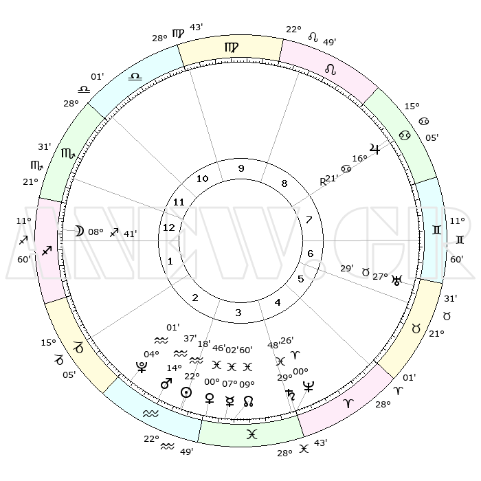 | | ΘΕΣΕΙΣ ΠΛΑΝΗΤΩΝ ΑΣΤΡΟΛΟΓΙΚΟΥ ΧΑΡΤΗ ΤΗΣ ΣΤΙΓΜΗΣ ΑΥΤΗΣ | | | | Πλανήτης | Ζώδιο | Μοίρες | Δεκαήμ. | Σε οίκο | Απόκλιση | | Ακμές των οίκων | | Ηλιος | Υδροχόος | 22°14' | Τρίτο | 3 | 14 S 06 | | 1ος | 23°23' | Σκορπιός | | Σελήνη | Τοξότης | 07°56' | Πρώτο | 1 | 26 S 49 | | 2ος | 23°41' | Τοξότης | | Ερμής | Ιχθείς | 06°56' | Πρώτο | 4 | 09 S 39 | | 3ος | 28°20' | Αιγόκερως | | Αφροδίτη | Ιχθείς | 00°42' | Πρώτο | 3 | 12 S 35 | | 4ος | 04°08' | Ιχθείς | | Αρης | Υδροχόος | 14°34' | Δεύτερο | 3 | 17 S 29 | | 5ος | 05°54' | Κριός | | Δίας | Καρκίνος | 16°21'R | Δεύτερο | 8 | 22 N 45 | | 6ος | 01°50' | Ταύρος | | Κρόνος | Ιχθείς | 29°47' | Τρίτο | 4 | 02 S 04 | | 7ος | 23°23' | Ταύρος | | Ουρανός | Ταύρος | 27°29' | Τρίτο | 7 | 19 N 25 | | 8ος | 23°41' | Δίδυμοι | | Ποσειδώνας | Κριός | 00°26' | Πρώτο | 4 | 01 S 02 | | 9ος | 28°20' | Καρκίνος | | Πλούτωνας | Υδροχόος | 04°01' | Πρώτο | 3 | 22 S 58 | | 10ος | 04°08' | Παρθένος | | Β. Δεσμός | Ιχθείς | 09°60' | Πρώτο | 4 | 07 S 49 | | 11ος | 05°54' | Ζυγός | | Ωροσκόπος | Σκορπιός | 23°23' | Τρίτο | | | 12ος | 01°50' | Σκορπιός | | Μεσουράνημα | Παρθένος | 04°08' | Πρώτο | | | |