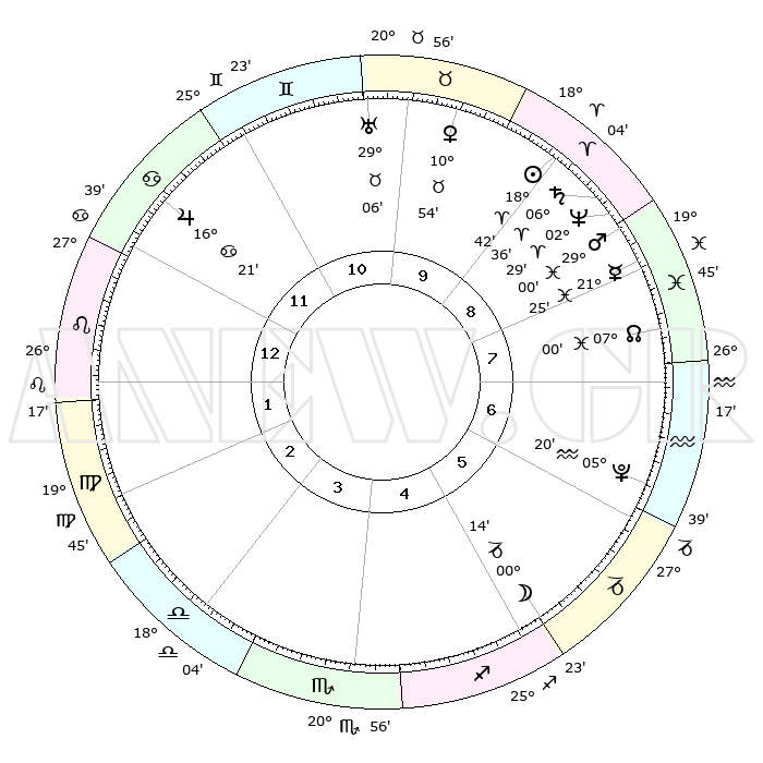 | | ΘΕΣΕΙΣ ΠΛΑΝΗΤΩΝ ΑΣΤΡΟΛΟΓΙΚΟΥ ΧΑΡΤΗ ΤΗΣ ΣΤΙΓΜΗΣ ΑΥΤΗΣ | | | | Πλανήτης | Ζώδιο | Μοίρες | Δεκαήμ. | Σε οίκο | Απόκλιση | | Ακμές των οίκων | | Ηλιος | Κριός | 18°39' | Δεύτερο | 9 | 07 N 18 | | 1ος | 11°36' | Λέων | | Σελήνη | Τοξότης | 29°38' | Τρίτο | 5 | 28 S 14 | | 2ος | 03°35' | Παρθένος | | Ερμής | Ιχθείς | 21°21' | Τρίτο | 8 | 05 S 28 | | 3ος | 00°11' | Ζυγός | | Αφροδίτη | Ταύρος | 10°50' | Δεύτερο | 10 | 14 N 57 | | 4ος | 02°23' | Σκορπιός | | Αρης | Ιχθείς | 28°58' | Τρίτο | 8 | 01 S 21 | | 5ος | 07°53' | Τοξότης | | Δίας | Καρκίνος | 16°21' | Δεύτερο | 12 | 22 N 48 | | 6ος | 11°49' | Αιγόκερως | | Κρόνος | Κριός | 06°35' | Πρώτο | 9 | 00 N 39 | | 7ος | 11°36' | Υδροχόος | | Ουρανός | Ταύρος | 29°06' | Τρίτο | 10 | 19 N 47 | | 8ος | 03°35' | Ιχθείς | | Ποσειδώνας | Κριός | 02°29' | Πρώτο | 9 | 00 S 13 | | 9ος | 00°11' | Κριός | | Πλούτωνας | Υδροχόος | 05°20' | Πρώτο | 6 | 22 S 47 | | 10ος | 02°23' | Ταύρος | | Β. Δεσμός | Ιχθείς | 07°00' | Πρώτο | 8 | 08 S 56 | | 11ος | 07°53' | Δίδυμοι | | Ωροσκόπος | Λέων | 11°36' | Δεύτερο | | | 12ος | 11°49' | Καρκίνος | | Μεσουράνημα | Ταύρος | 02°23' | Πρώτο | | | |