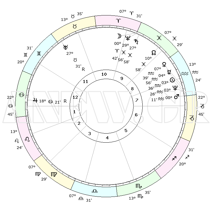 | | ΘΕΣΕΙΣ ΠΛΑΝΗΤΩΝ ΑΣΤΡΟΛΟΓΙΚΟΥ ΧΑΡΤΗ ΤΗΣ ΣΤΙΓΜΗΣ ΑΥΤΗΣ | | | | Πλανήτης | Ζώδιο | Μοίρες | Δεκαήμ. | Σε οίκο | Απόκλιση | | Ακμές των οίκων | | Ηλιος | Υδροχόος | 03°32' | Πρώτο | 8 | 19 S 22 | | 1ος | 29°36' | Δίδυμοι | | Σελήνη | Ιχθείς | 29°42' | Τρίτο | 10 | 01 N 33 | | 2ος | 20°25' | Καρκίνος | | Ερμής | Υδροχόος | 04°48' | Πρώτο | 8 | 21 S 05 | | 3ος | 12°12' | Λέων | | Αφροδίτη | Υδροχόος | 07°34' | Πρώτο | 8 | 19 S 32 | | 4ος | 08°27' | Παρθένος | | Αρης | Υδροχόος | 00°08' | Πρώτο | 8 | 21 S 06 | | 5ος | 12°20' | Ζυγός | | Δίας | Καρκίνος | 18°22'R | Δεύτερο | 1 | 22 N 28 | | 6ος | 22°21' | Σκορπιός | | Κρόνος | Ιχθείς | 27°58' | Τρίτο | 10 | 02 S 49 | | 7ος | 29°36' | Τοξότης | | Ουρανός | Ταύρος | 27°31'R | Τρίτο | 12 | 19 N 25 | | 8ος | 20°25' | Αιγόκερως | | Ποσειδώνας | Ιχθείς | 29°55' | Τρίτο | 10 | 01 S 14 | | 9ος | 12°12' | Υδροχόος | | Πλούτωνας | Υδροχόος | 03°26' | Πρώτο | 8 | 23 S 04 | | 10ος | 08°27' | Ιχθείς | | Β. Δεσμός | Ιχθείς | 10°59' | Δεύτερο | 10 | 07 S 27 | | 11ος | 12°20' | Κριός | | Ωροσκόπος | Δίδυμοι | 29°36' | Τρίτο | | | 12ος | 22°21' | Ταύρος | | Μεσουράνημα | Ιχθείς | 08°27' | Πρώτο | | | |