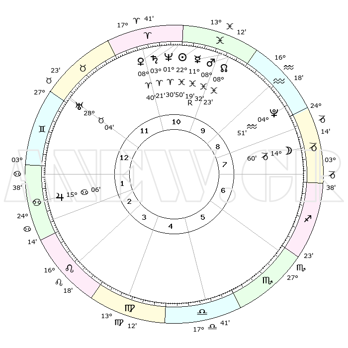 | | ΘΕΣΕΙΣ ΠΛΑΝΗΤΩΝ ΑΣΤΡΟΛΟΓΙΚΟΥ ΧΑΡΤΗ ΤΗΣ ΣΤΙΓΜΗΣ ΑΥΤΗΣ | | | | Πλανήτης | Ζώδιο | Μοίρες | Δεκαήμ. | Σε οίκο | Απόκλιση | | Ακμές των οίκων | | Ηλιος | Ιχθείς | 22°47' | Τρίτο | 10 | 02 S 52 | | 1ος | 16°27' | Δίδυμοι | | Σελήνη | Αιγόκερως | 14°23' | Δεύτερο | 8 | 26 S 56 | | 2ος | 08°31' | Καρκίνος | | Ερμής | Ιχθείς | 11°21'R | Δεύτερο | 10 | 04 S 44 | | 3ος | 29°46' | Καρκίνος | | Αφροδίτη | Κριός | 08°36' | Πρώτο | 11 | 02 N 24 | | 4ος | 24°09' | Λέων | | Αρης | Ιχθείς | 08°30' | Πρώτο | 10 | 09 S 24 | | 5ος | 25°40' | Παρθένος | | Δίας | Καρκίνος | 15°06' | Δεύτερο | 2 | 22 N 56 | | 6ος | 05°51' | Σκορπιός | | Κρόνος | Κριός | 03°20' | Πρώτο | 11 | 00 S 37 | | 7ος | 16°27' | Τοξότης | | Ουρανός | Ταύρος | 28°04' | Τρίτο | 12 | 19 N 33 | | 8ος | 08°31' | Αιγόκερως | | Ποσειδώνας | Κριός | 01°30' | Πρώτο | 11 | 00 S 36 | | 9ος | 29°46' | Αιγόκερως | | Πλούτωνας | Υδροχόος | 04°51' | Πρώτο | 9 | 22 S 50 | | 10ος | 24°09' | Υδροχόος | | Β. Δεσμός | Ιχθείς | 08°23' | Πρώτο | 10 | 08 S 25 | | 11ος | 25°40' | Ιχθείς | | Ωροσκόπος | Δίδυμοι | 16°27' | Δεύτερο | | | 12ος | 05°51' | Ταύρος | | Μεσουράνημα | Υδροχόος | 24°09' | Τρίτο | | | |
