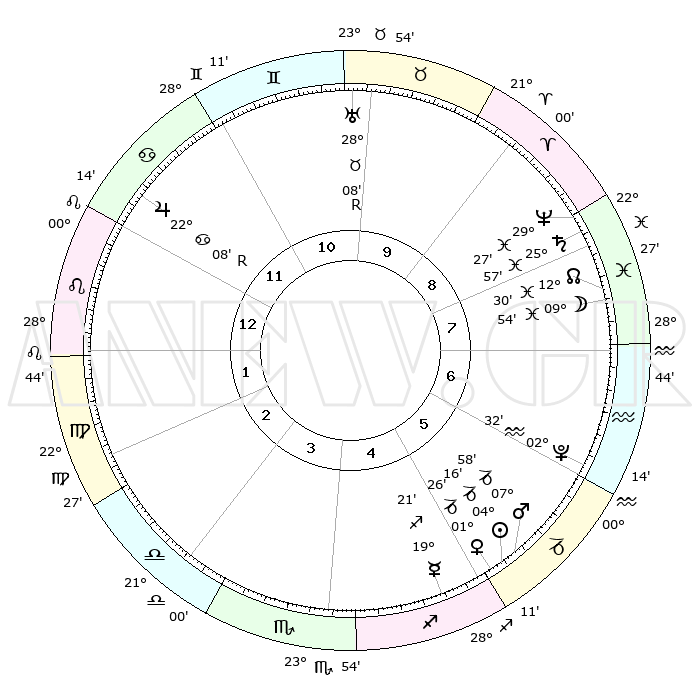 | | ΘΕΣΕΙΣ ΠΛΑΝΗΤΩΝ ΑΣΤΡΟΛΟΓΙΚΟΥ ΧΑΡΤΗ ΤΗΣ ΣΤΙΓΜΗΣ ΑΥΤΗΣ | | | | Πλανήτης | Ζώδιο | Μοίρες | Δεκαήμ. | Σε οίκο | Απόκλιση | | Ακμές των οίκων | | Ηλιος | Αιγόκερως | 04°11' | Πρώτο | 5 | 23 S 22 | | 1ος | 05°59' | Λέων | | Σελήνη | Ιχθείς | 08°53' | Πρώτο | 8 | 08 S 26 | | 2ος | 27°28' | Λέων | | Ερμής | Τοξότης | 19°14' | Δεύτερο | 5 | 22 S 50 | | 3ος | 23°20' | Παρθένος | | Αφροδίτη | Αιγόκερως | 01°20' | Πρώτο | 5 | 23 S 41 | | 4ος | 25°02' | Ζυγός | | Αρης | Αιγόκερως | 07°55' | Πρώτο | 6 | 24 S 03 | | 5ος | 00°52' | Τοξότης | | Δίας | Καρκίνος | 22°09'R | Τρίτο | 12 | 21 N 50 | | 6ος | 05°37' | Αιγόκερως | | Κρόνος | Ιχθείς | 25°57' | Τρίτο | 9 | 03 S 42 | | 7ος | 05°59' | Υδροχόος | | Ουρανός | Ταύρος | 28°08'R | Τρίτο | 10 | 19 N 33 | | 8ος | 27°28' | Υδροχόος | | Ποσειδώνας | Ιχθείς | 29°26' | Τρίτο | 9 | 01 S 27 | | 9ος | 23°20' | Ιχθείς | | Πλούτωνας | Υδροχόος | 02°32' | Πρώτο | 6 | 23 S 15 | | 10ος | 25°02' | Κριός | | Β. Δεσμός | Ιχθείς | 12°30' | Δεύτερο | 8 | 06 S 52 | | 11ος | 00°52' | Δίδυμοι | | Ωροσκόπος | Λέων | 05°59' | Πρώτο | | | 12ος | 05°37' | Καρκίνος | | Μεσουράνημα | Κριός | 25°02' | Τρίτο | | | |