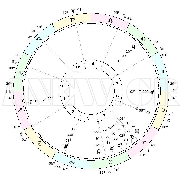 | | ΘΕΣΕΙΣ ΠΛΑΝΗΤΩΝ ΑΣΤΡΟΛΟΓΙΚΟΥ ΧΑΡΤΗ ΤΗΣ ΣΤΙΓΜΗΣ ΑΥΤΗΣ | | | | Πλανήτης | Ζώδιο | Μοίρες | Δεκαήμ. | Σε οίκο | Απόκλιση | | Ακμές των οίκων | | Ηλιος | Κριός | 16°59' | Δεύτερο | 5 | 06 N 40 | | 1ος | 10°21' | Σκορπιός | | Σελήνη | Τοξότης | 09°34' | Πρώτο | 2 | 26 S 59 | | 2ος | 09°28' | Τοξότης | | Ερμής | Ιχθείς | 19°25' | Δεύτερο | 4 | 06 S 05 | | 3ος | 12°24' | Αιγόκερως | | Αφροδίτη | Ταύρος | 08°46' | Πρώτο | 6 | 14 N 14 | | 4ος | 17°20' | Υδροχόος | | Αρης | Ιχθείς | 27°39' | Τρίτο | 5 | 01 S 52 | | 5ος | 19°59' | Ιχθείς | | Δίας | Καρκίνος | 16°12' | Δεύτερο | 9 | 22 N 49 | | 6ος | 17°35' | Κριός | | Κρόνος | Κριός | 06°23' | Πρώτο | 5 | 00 N 34 | | 7ος | 10°21' | Ταύρος | | Ουρανός | Ταύρος | 29°01' | Τρίτο | 7 | 19 N 46 | | 8ος | 09°28' | Δίδυμοι | | Ποσειδώνας | Κριός | 02°26' | Πρώτο | 5 | 00 S 14 | | 9ος | 12°24' | Καρκίνος | | Πλούτωνας | Υδροχόος | 05°18' | Πρώτο | 3 | 22 S 47 | | 10ος | 17°20' | Λέων | | Β. Δεσμός | Ιχθείς | 07°06' | Πρώτο | 4 | 08 S 54 | | 11ος | 19°59' | Παρθένος | | Ωροσκόπος | Σκορπιός | 10°21' | Δεύτερο | | | 12ος | 17°35' | Ζυγός | | Μεσουράνημα | Λέων | 17°20' | Δεύτερο | | | |